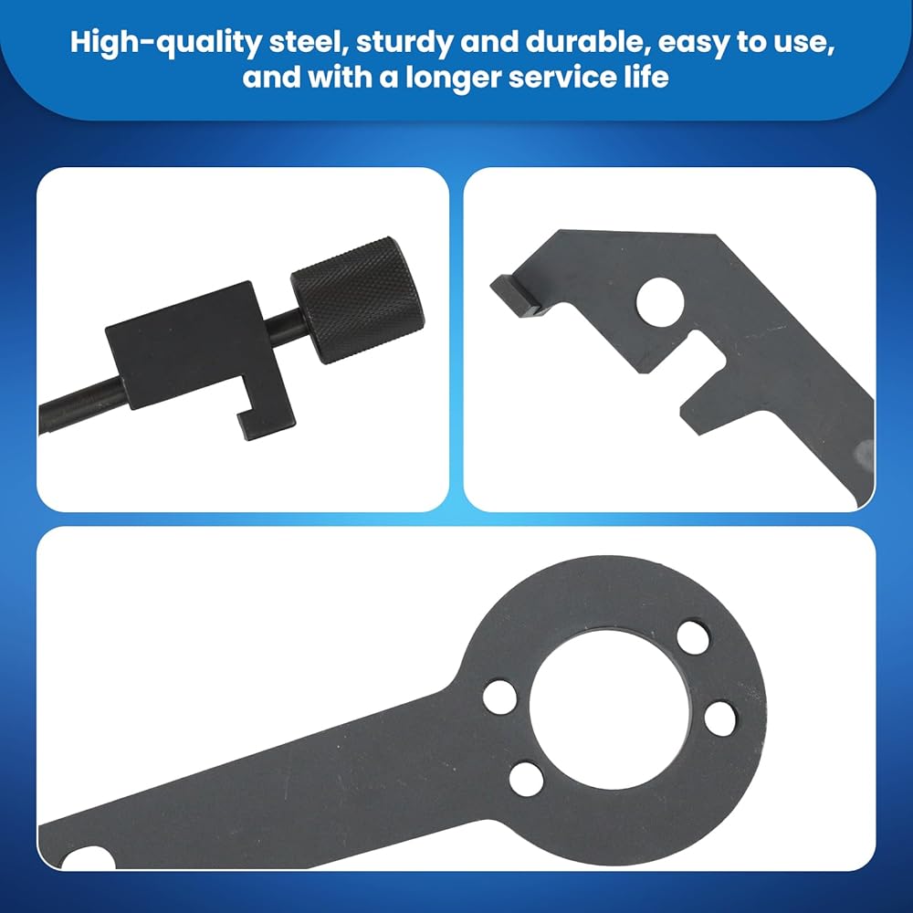 The engine timing tool kit is made of heavy-duty forged steel with black-oxide coating on the adapter, which has maximum strength, and can prevent rust and corrosion