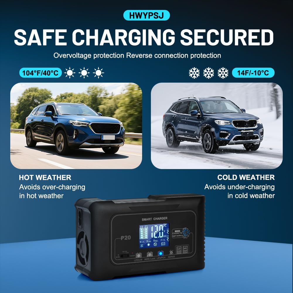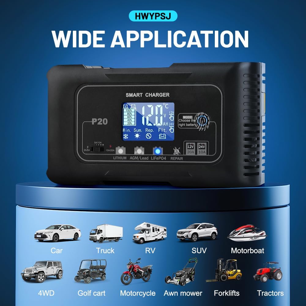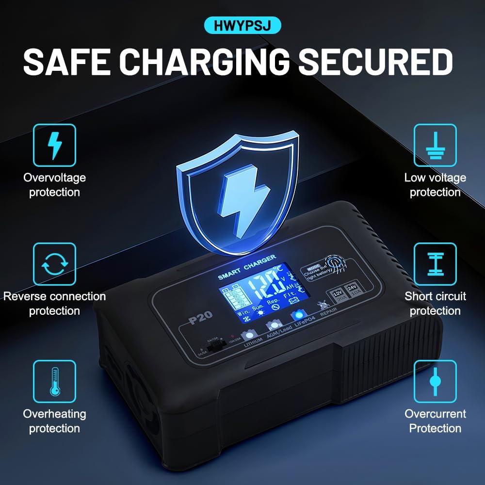 1. شاحن بطارية Smart : تحديد تلقائي للبطاريات ، لا حاجة إلى اختيار ومراقبة عملية الشحن بذكاء مع وحدة المعالجة المركزية الخاصة بها. إنه يتحول إلى تحطيم شحن شحن ما بعد الكامل ويتميز بوظيفة إصلاح النبض لتجديد الأداء وتمديد عمر البطارية.