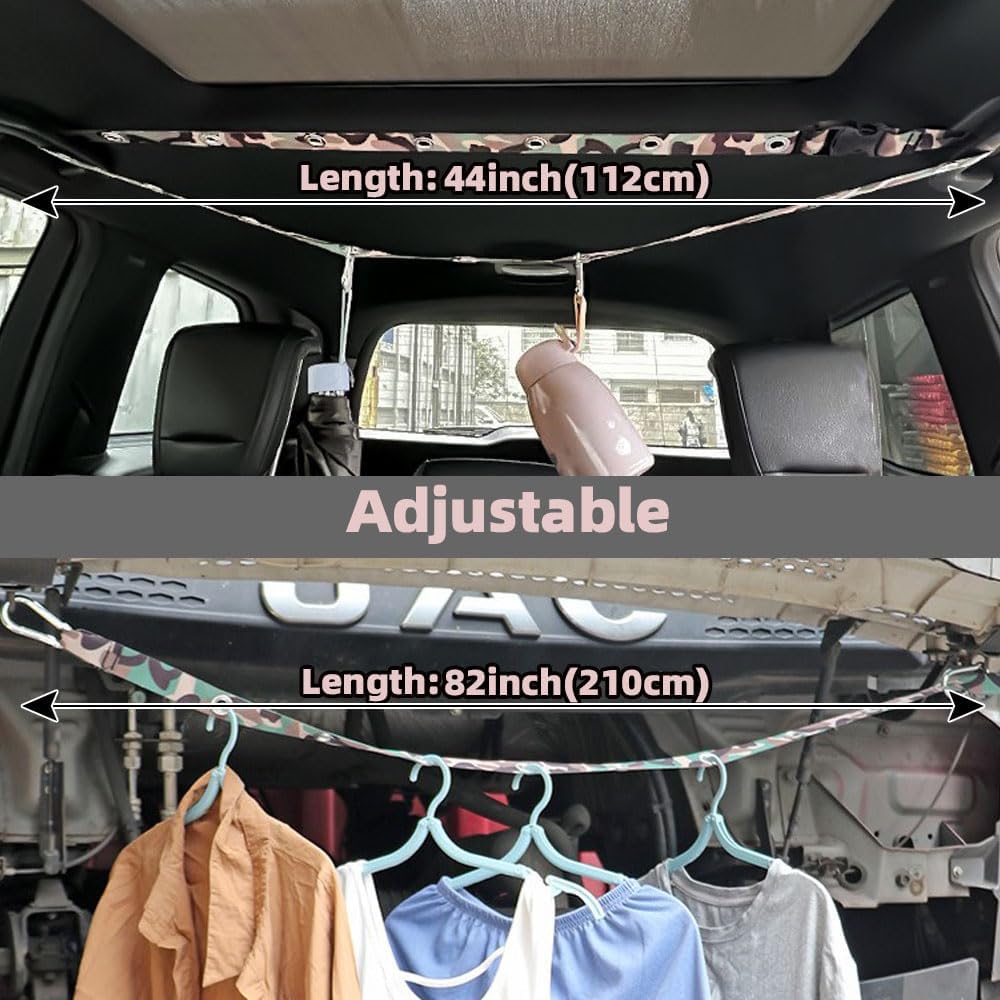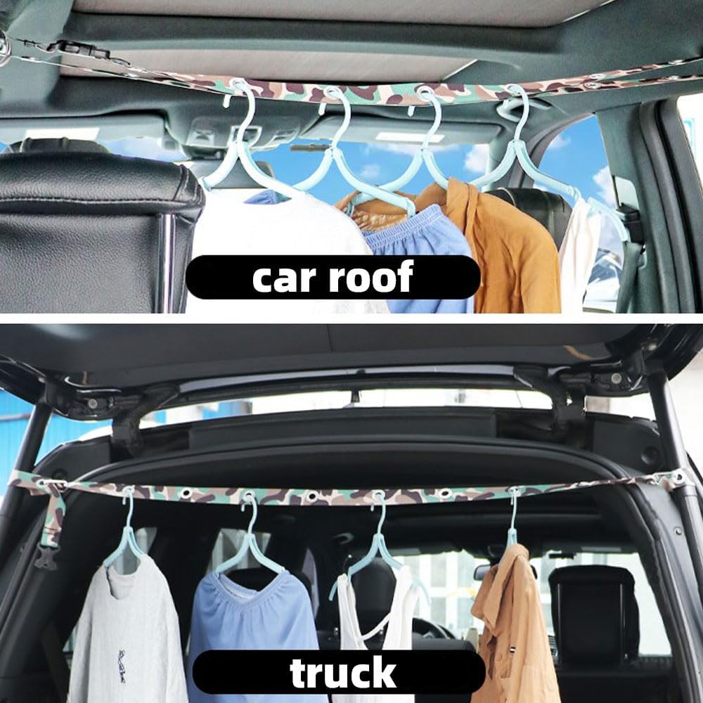 Clothes Rack for Car:Easy to store car clothes hanger belt with 10 Carabiners,The MAX length of the clothes rack is 47inch(120cm)