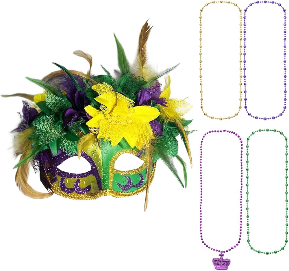 3. قلادة خرز متلألئة احتفالية وقناع تنكري رائع مثالي لماردي غرا أو أي حفلة لباس. اشعر بالمراسلة التي ترتدي هذا الرأس Mardi Gras Cape وقناع Mardi Gras الخاص بك ؛