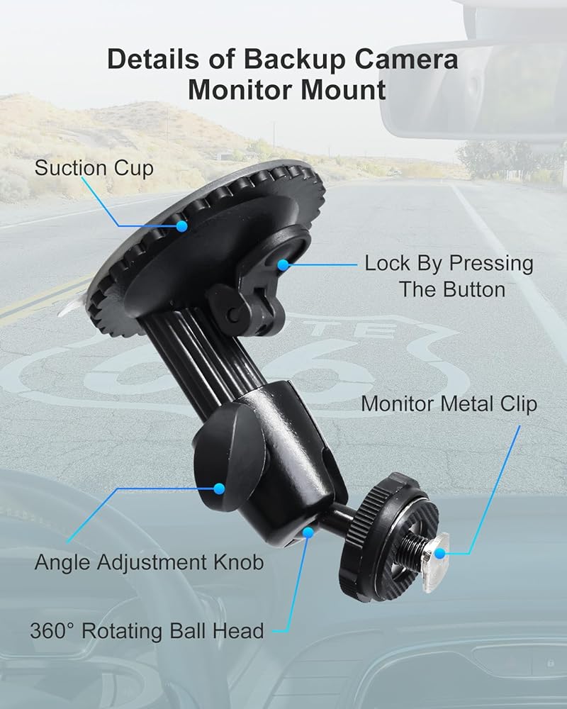 【الشفط المحسن مع الحمل القوي】-يتميز شاشة كاميرا النسخ الاحتياطي بالسيارة هذا بكوب شفط PU فريد من نوعه بحجم 2.75 بوصة والتصاق المدمج. مع قدرة وزن تزيد على 5000 جم ، فإنه يدعم بسهولة شاشات أكبر من 5 بوصات ، مما يضمن السلامة حتى على الطرق الوعرة