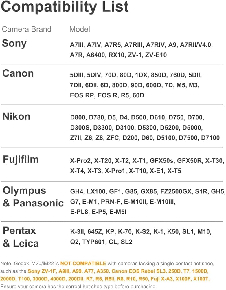 نصائح: فلاش Godox IM30 Mini غير متوافق مع Sony ZV-1F ، A9III ، A99 ، A77 ، A350. غير متوافق مع Canon EOS Rebel SL3 ، 250D ، T7 ، 1500D ، 2000D ، T100 ، 3000D ، 4000D ، 200DII ، R7 ، R6II ، R8 ، R10 ، R50. غير متوافق مع Fuji X-A3 ، X100F ، X100T. تحقق من "قائمة توافق الكاميرا" في صور المنتج قبل الشراء لضمان التوافق المناسب.