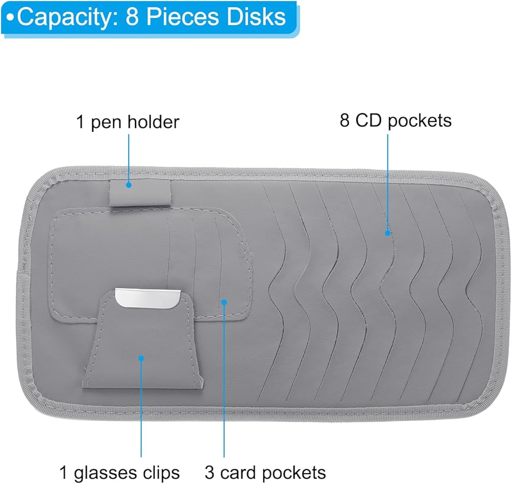 هذه حقيبة تخزين لتخزين الأقراص المضغوطة أو أقراص DVD أو السجلات أو أقراص الألعاب أو الأقلام أو البطاقات أو الأشياء الصغيرة الأخرى. يستخدم على نطاق واسع في واقي السيارة أو الأسطح المسطحة الأخرى.