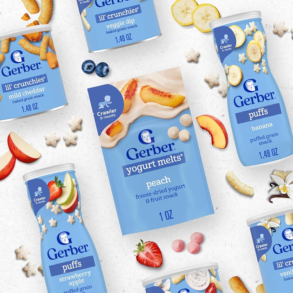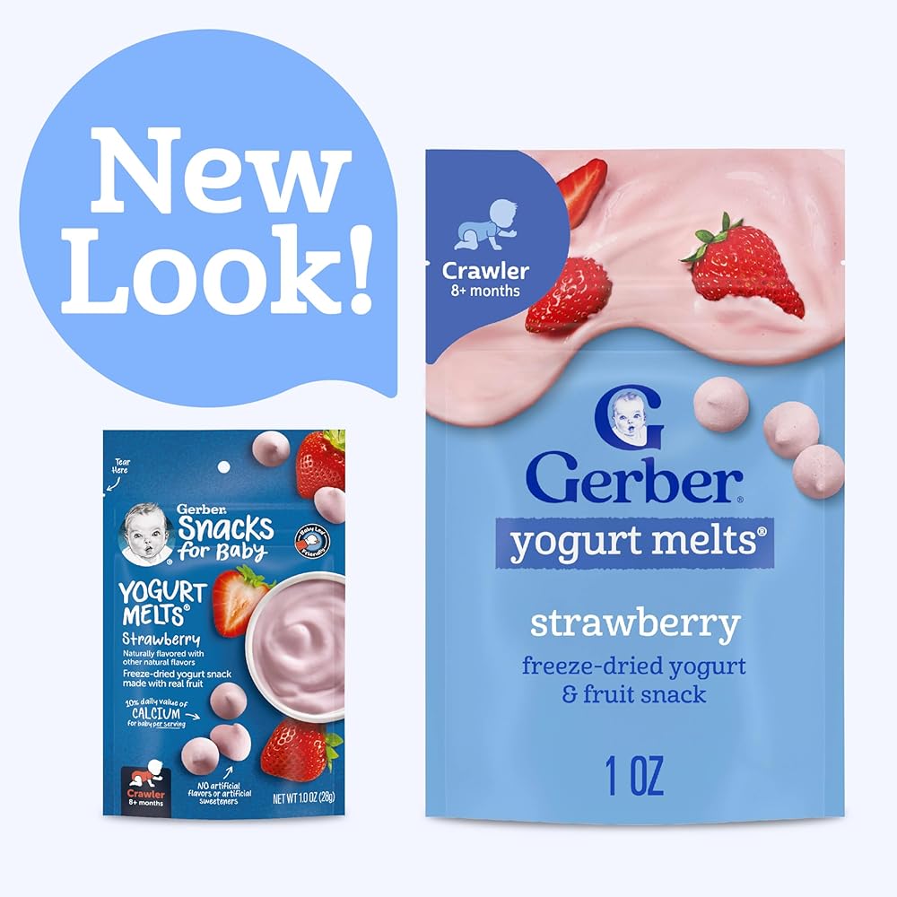 Make every little bite count with the goodness of Gerber Yogurt Melts Freeze-Dried Yogurt & Fruit snacks. These tasty snacks are made with real yogurt and fruit and no artificial flavors or artificial sweeteners. Gerber Yogurt Melts are an ideal snack for your older baby learning learning to self feed with pieces that are perfectly sized for picking up and a melt-in-your-mouth texture for easy chewing and swallowing.
