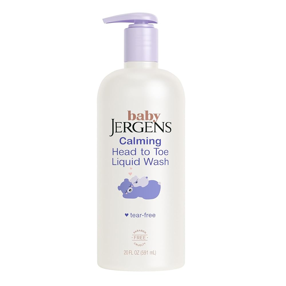 The new Baby Jergens collection is a familiar kind of feel good because it's a brand that's been trusted for generations. And if you're new to the Baby Jergens collection, Baby Jergens Calming Head to Toe Liquid Baby Wash is a perfect product to try. It's a tear free baby wash and shampoo that gently cleanses and moisturizes your baby's skin and hair. But don't worry– it doesn't dry skin out! Pediatrician and dermatologist tested, this body wash is great for baby's delicate skin and hair. Feel good knowing that it's also paraben free, phthalate free formula, artificial dye free and cruelty free too. This formula is manufactured using 100% certified renewable energy and this baby wash formula is safe for the environment by maximizing biodegradability and respecting aquatic life. Not only is it suitable for your baby, but this baby shampoo and body wash can be part of a night time routine to help calm your baby before bed. Infused with Shea and lavender oils, our baby wash creates a soothing atmosphere that's comforting at night time when paired with Baby Jergens Calming Lotion. Use this calming routine daily for sweeter dreams: first, run a warm bath. Next, spread 1-2 pumps of the baby wash onto your baby's skin and hair. Then rinse thoroughly, dry off, pair with the Baby Jergens Calming Lotion and snuggle up. Try our whole line of gentle, nurturing baby products from Jergens, a brand trusted for generations. Baby Jergens Calming Lotion softens, Baby Jergens Soothing Sensitive Skin Cream soothes dry skin and Baby Jergens All-Purpose Ointment helps lock in moisture. The whole collection gives you that feel-good feeling because Jergens has been around for over a hundred years, using trusted ingredients that you can feel good about using on even the tiniest loved ones in your family.