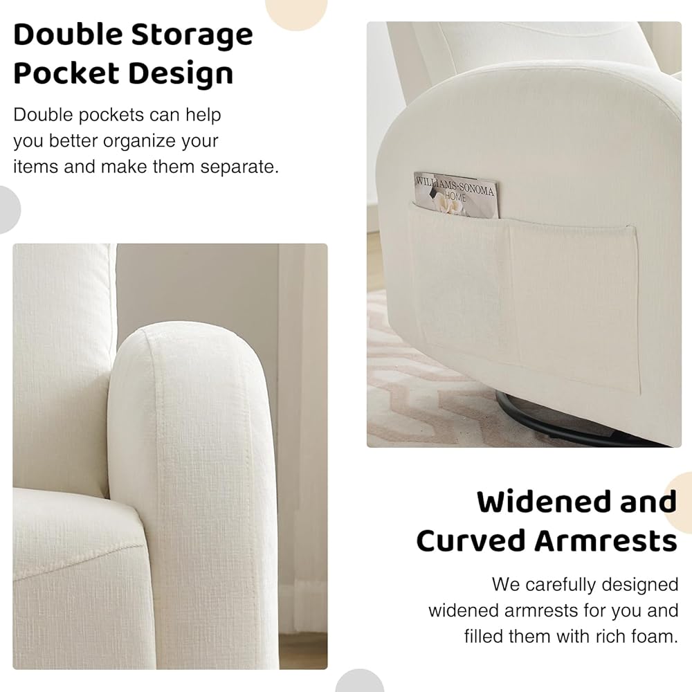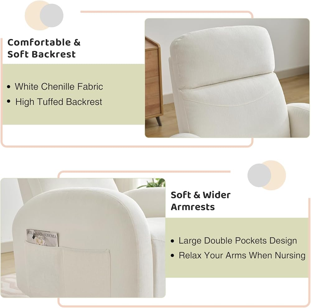 【360 ° دوار كراسي الحضانة Rocking】 كرسي Rocivel Rocker للبالغين لديه 360 درجة دوارة ، 30 درجة هزاز ، و 105-165 زاوية مستلقية للاستخدام متعدد الاستخدامات. يمكن أن يدور هذا الدوران ، ويهتز ، وضبط دواسة القدم لتحقيق منطقة راحة مثالية لجسمك ، سواء كنت أمًا حاملًا أو أحد الوالدين مع طفل مسن أو مريض يتعافى في المنزل. سيكون كرسي دوارة الشراكة متوافقة مع غرفتك ، سواء في غرفة النوم أو غرفة المعيشة أو غرفة الحضانة.