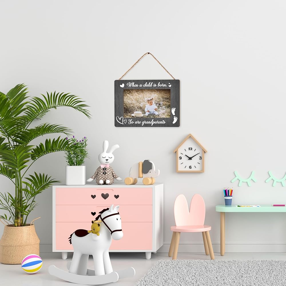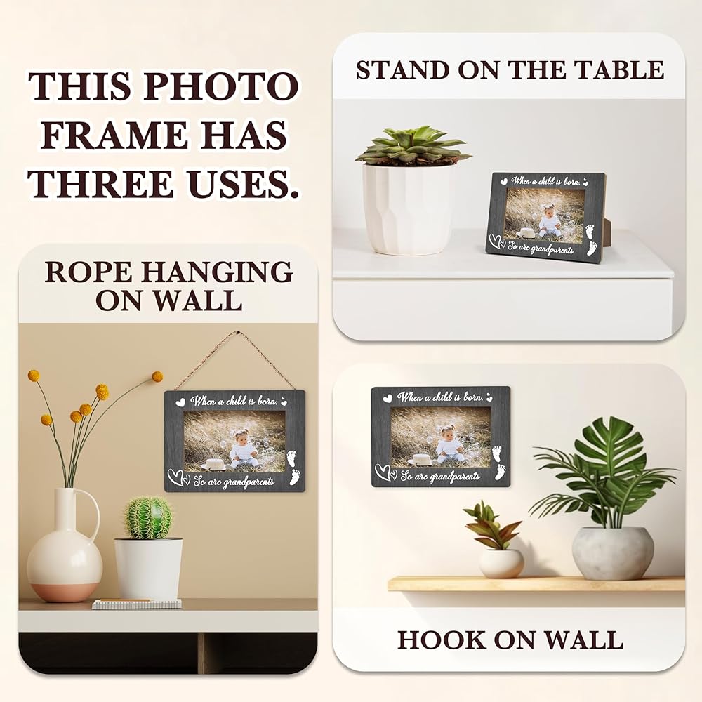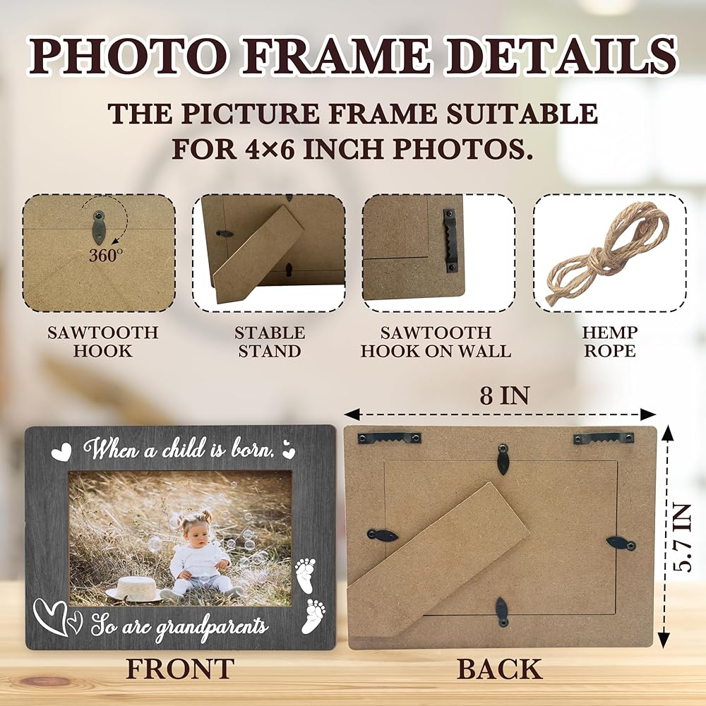 Frame Size:The wooden photo frame measures 8 x 5.7 inches and can hold 4 x 6 inches photos. The frame has stand at the back and it can stand stably on the table. The package also includes twine to hang the photo frame, the photo frame has a variety of display options. suitable for placing in cozy environments such as the nursery, living room or bedroom.