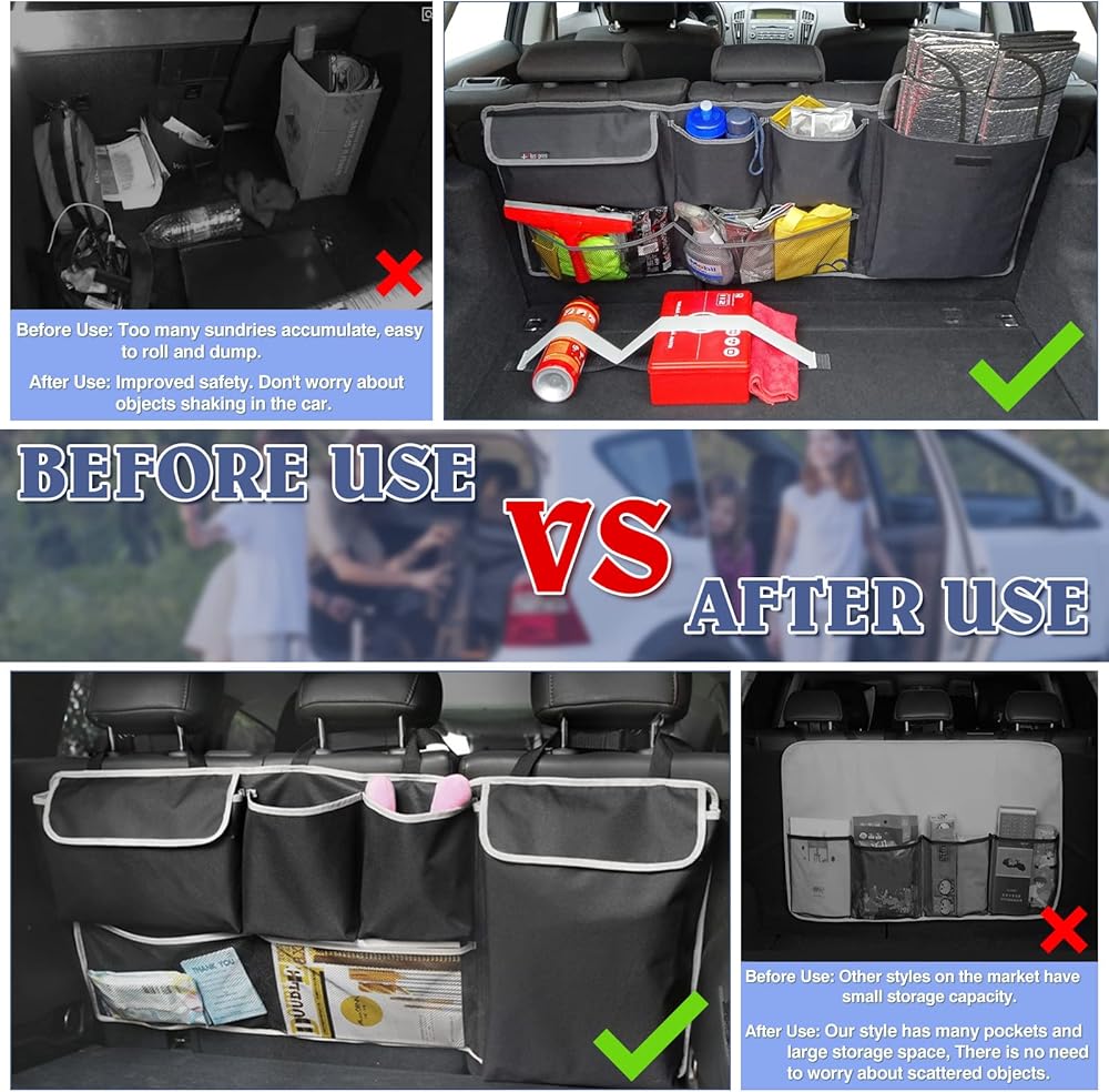 [سعة كبيرة] حافظ على منظمات سيارتك أنيقة ومرتبة مع 6 جيوب. الحجم الكبير 39 انش × 18 انش مثالي لتخزين جميع فوضى سيارتك، من مكنسة السيارة والمضخة القابلة للنفخ وأدوات تفاصيل السيارة إلى المظلة والمياه. يتم ربط منظم شبكة صندوق السيارة بظهر المقعد حتى لا ينزلق مثل الصندوق.