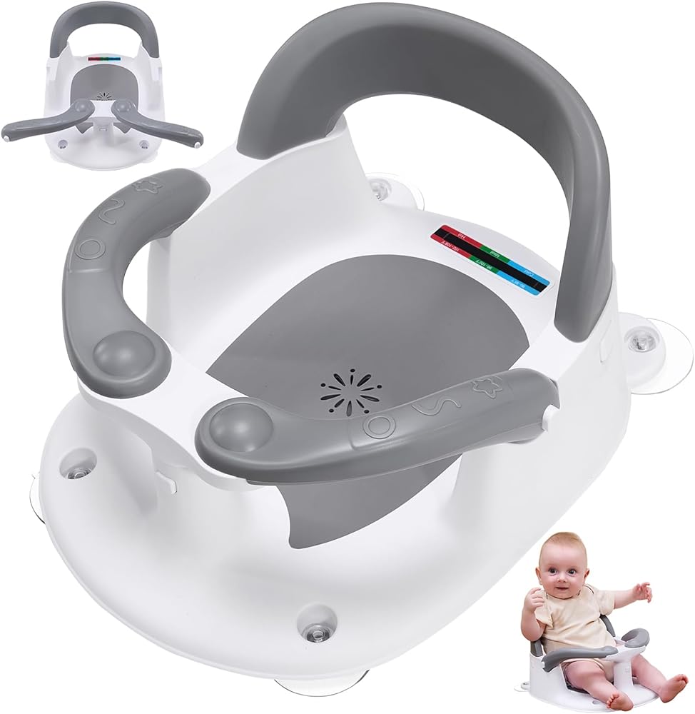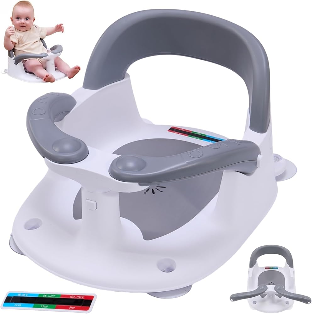 مقعد حمام الطفل للأطفال لمدة 6 أشهر وأعلى جالسًا ، مقعد حمام للرضع مع تنبيه درجة الحرارة+مسند الظهر المفتوح+مسند الذراع ، كرسي حمام الطفل على حوض الاستحمام ، الحوض ، بالوعة رمادي