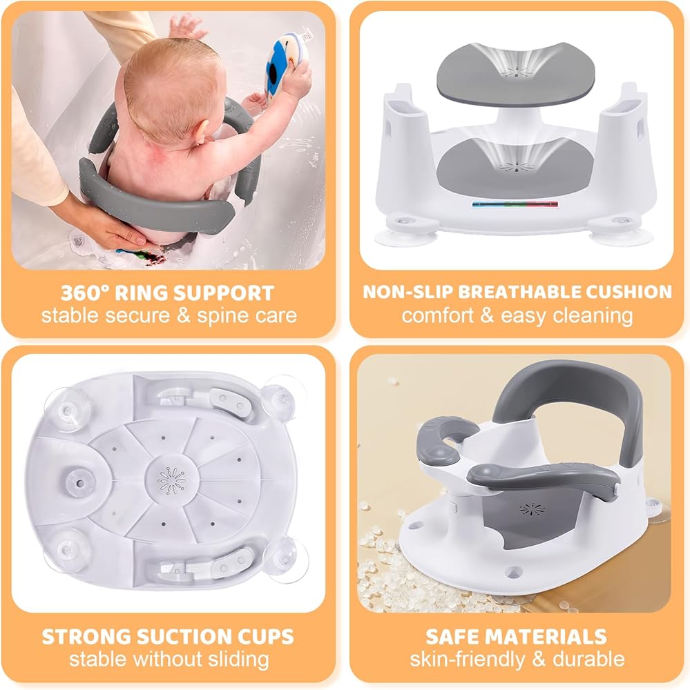 الدعم الخاتم الكامل المريح: يجلس الطفل بشكل مريح وثابت-تم تصميم مقاعد الحمام لهذا الأطفال الذين يجلسون بهيكل آمن وملف يبقى أمانك آمنًا ومريحًا ، تمامًا مثل أن تكون أمي. مثالي لمقاعد الحمام للأطفال الذين يجلسون ، يمنع التحول ويضمن وقت حمام آمن ومريح لطفلك الصغير. مقعد حمام الرضع هذا المثالي للطفل من 6 إلى 24 شهرًا.