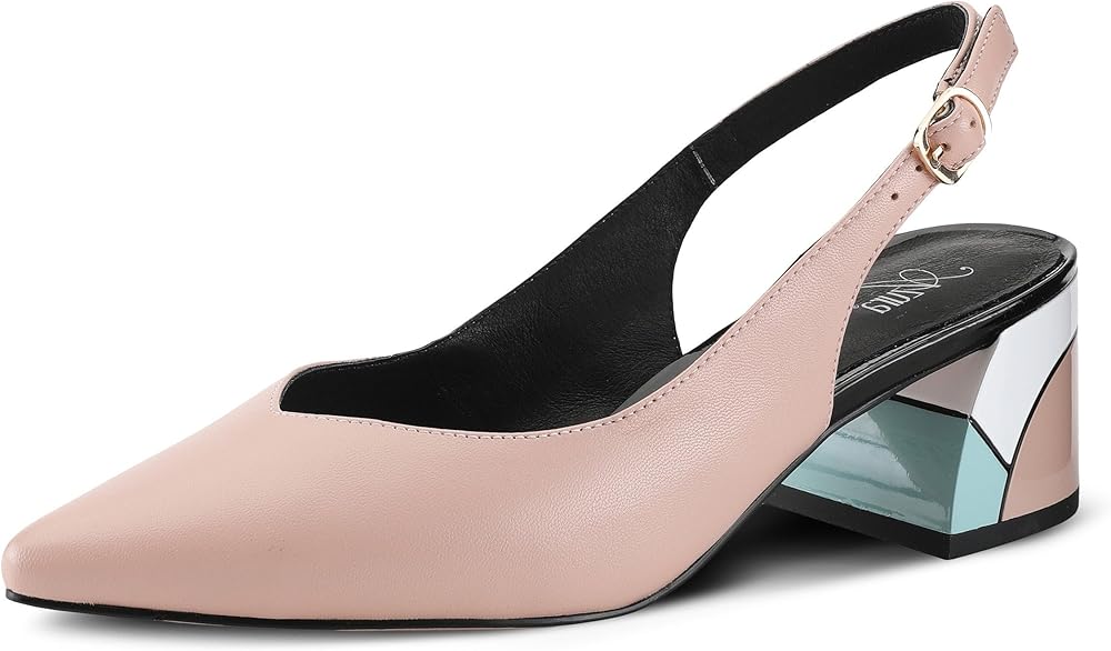 Azura Style: PRETTY Chic quality leather slingback pointed toe dress shoe highlighting a beautifully sculpted fashion heel on a comfort sole. Heel Height: 2 1/4" Platform Height: 1/2" Features: - Upper: Leather - Lining: Leather - Insole: Leather - Outsole: Rubber - Closure: Buckle - Heel Type: Architectural, Block, Chunky, Sculpted - Toe Type: Closed toe, Pointed toe - Features: Comfort, Elastic, Padded Insole, Premium