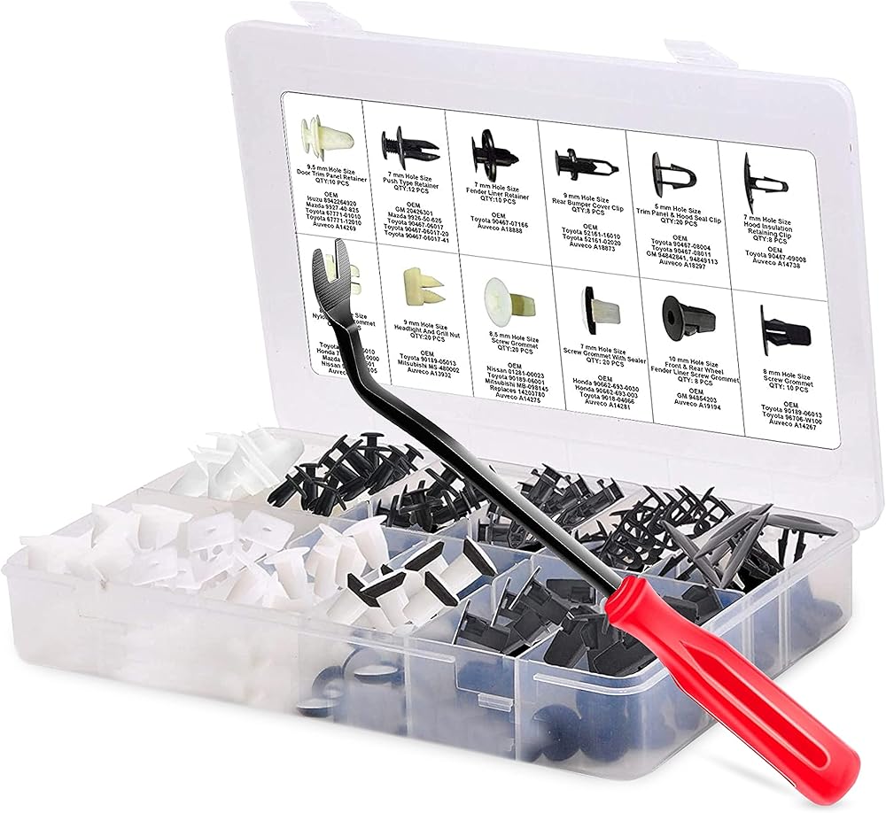 مجموعة صندوق مشابك تثبيت Toyota من 166 قطعة من AFA من مجموعة الأدوات من 166 قطعة مع معظم المقاسات والتطبيقات الشائعة. مصنوع من النايلون المتين للغاية ولن ينكسر على الفور مثل العلامات التجارية الأخرى. رائعة للاستخدامات الأكثر شعبية مثل: حافة الباب، الحامل، غطاء الرأس والممتص للصدمات من أجل تويوتا، ليكسوس، مازدا والعلامات التجارية الأخرى. يغطي مقاسات ثقب 5 مم إلى 10 مم والعديد من البراغي لاستبدال OEM الدقيق للمثبات القديمة أو البالية أو المكسورة. 12 مساحة تخزين سهلة القراءة مع قوائم كاملة لأحجام القطع والكمية. يحتوي المنتج على مزيل تثبيت متين من أجل إزالة آمنة للمشابك المعدنية أو البلاستيكية. نضمن لك رضاك عن المنتج بنسبة 100%. القائمة الكاملة: