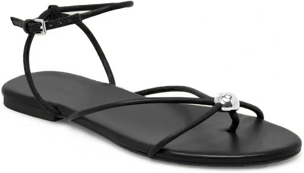 تصميم أنيق: هذه الصنادل السوداء الضيقة لها أشرطة معقدة مع إغلاق مشبك وتفاصيل كرة ذهبية ، ومزج عناصر كلاسيكية وعصرية ، مما يضيف بريقًا مثاليًا إلى ملابسك