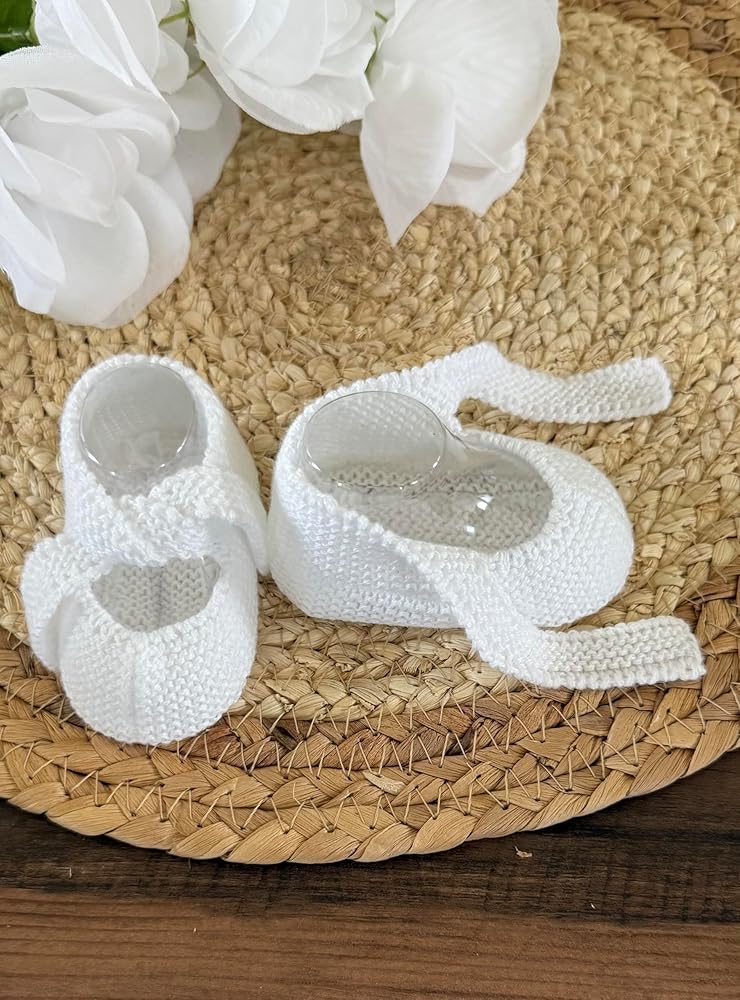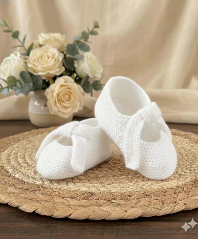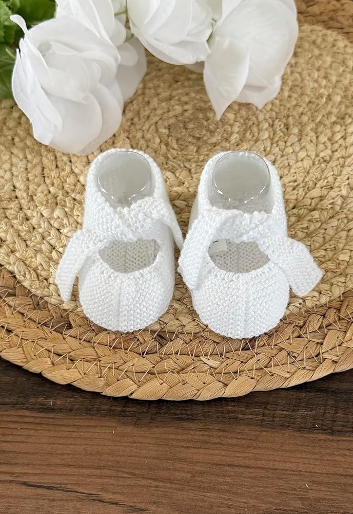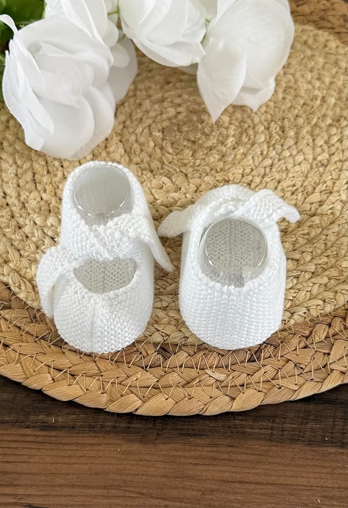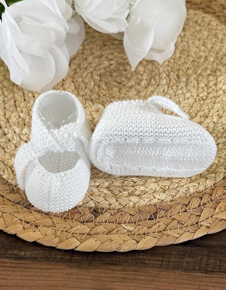 Wrap your little one's tiny feet in pure comfort with these adorable knitted baby booties. Crafted from soft cotton yarn in a delicate shade, these booties showcase expert craftsmanship with their intricate knit pattern. The gentle, stretchy construction allows for easy fitting while ensuring your baby's feet stay cozy and warm. Perfect for both indoor wear and special occasions, these booties feature a secure fit that helps them stay in place on active little feet. The breathable cotton material makes these booties suitable for year-round use, keeping tiny toes comfortable in any season. The classic design and timeless color make these booties an ideal gift for baby showers or new parents. The durable knit construction maintains its shape while being gentle enough for delicate baby skin.