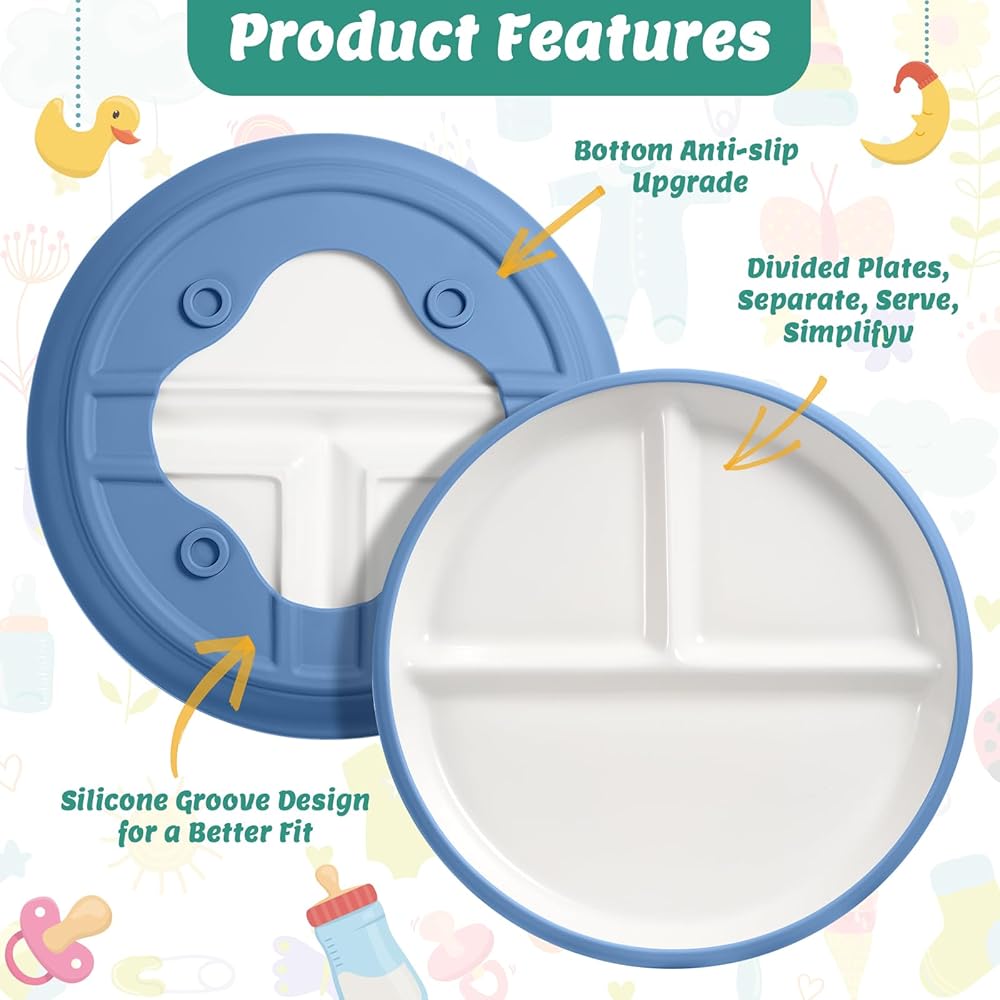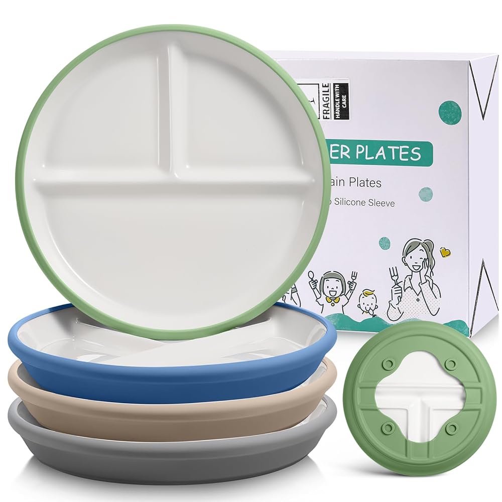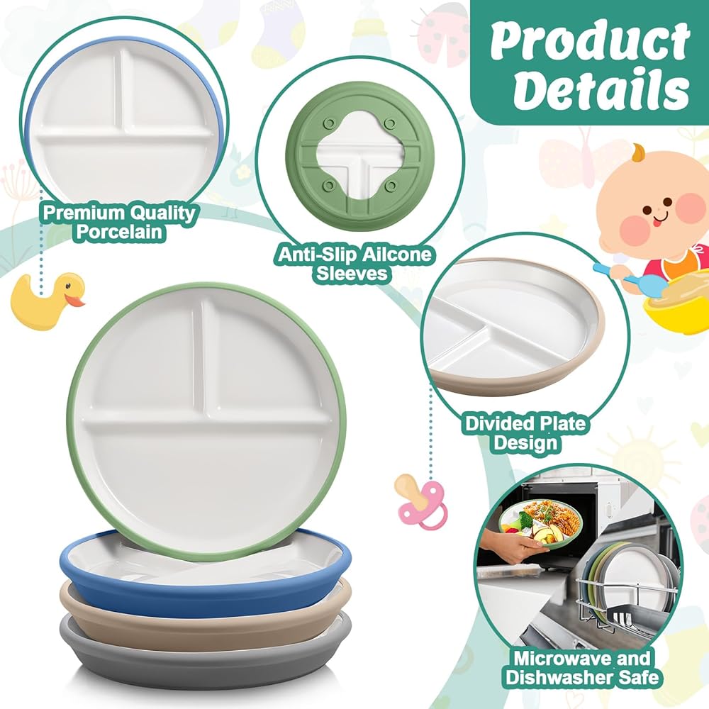 Our toddler plates are ideal for your kids! Made from quality porcelain, each plate comes with a colorful, silicone sleeve that prevents slipping or sliding on the table, making mealtime less messy