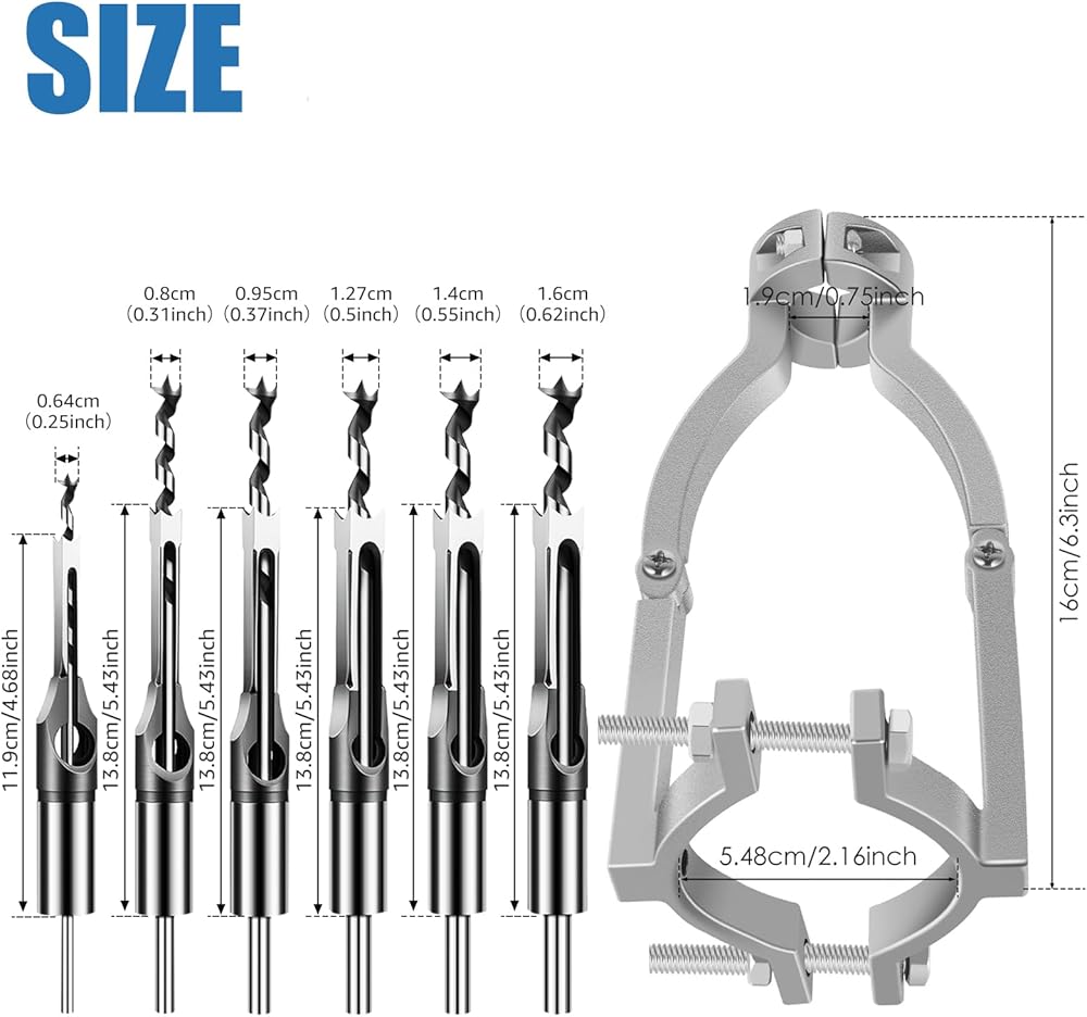 • [What You Receive] The package includes 1 square hole drill bit adapter, and 6 square hole drill bits. The drill diameter includes 1/4 inch (6.4mm), 5/16 inch (8mm), 3/8 inch (9.5mm), 7/16inch (11mm), 1/2 inch (12.7mm), 5/8inch (16mm). The hand drill clamp diameter from 38 to 55mm/1.5 to 2.2 inch. Note: It is only suitable for bench drills and hand drills with clamps.