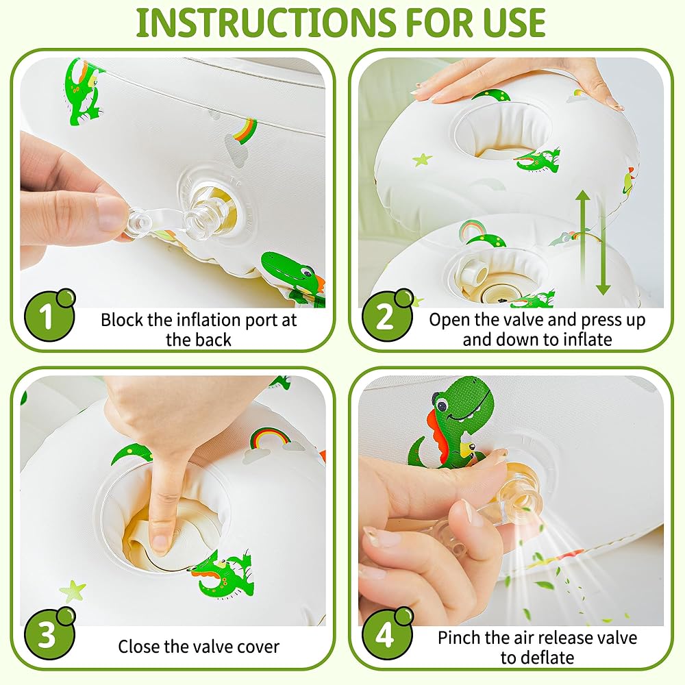 • Easy to Use, and Portable: The inflatable baby seat can be easily inflated within 3 minutes by pressing the built-in air pump up and down. Due to the leak-proof design, it is necessary to pinch the air valve when deflating. After deflating, fold it back to a small size for putting away, which is perfect for trips to the beach, camping or park.