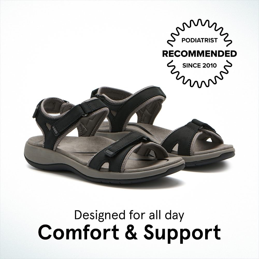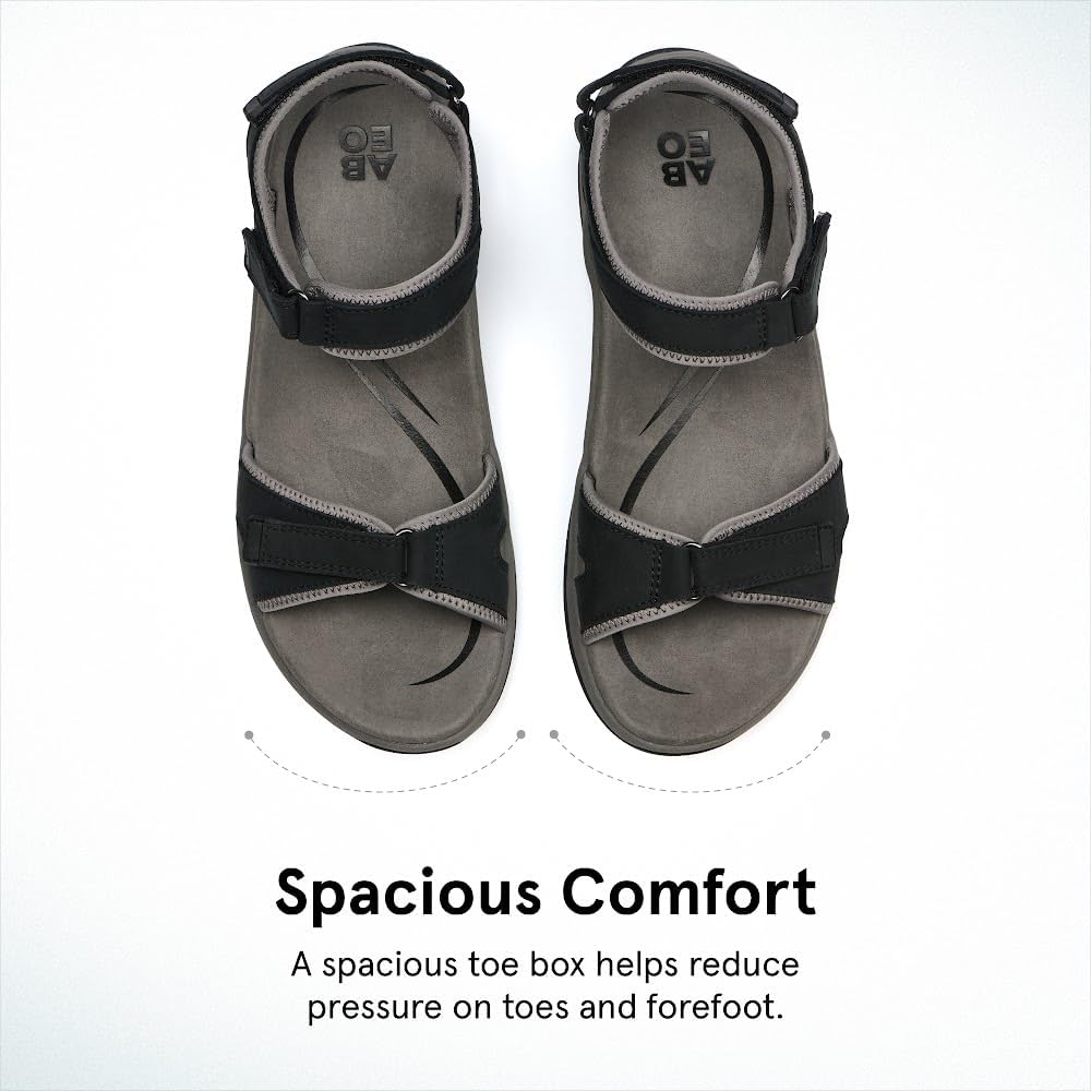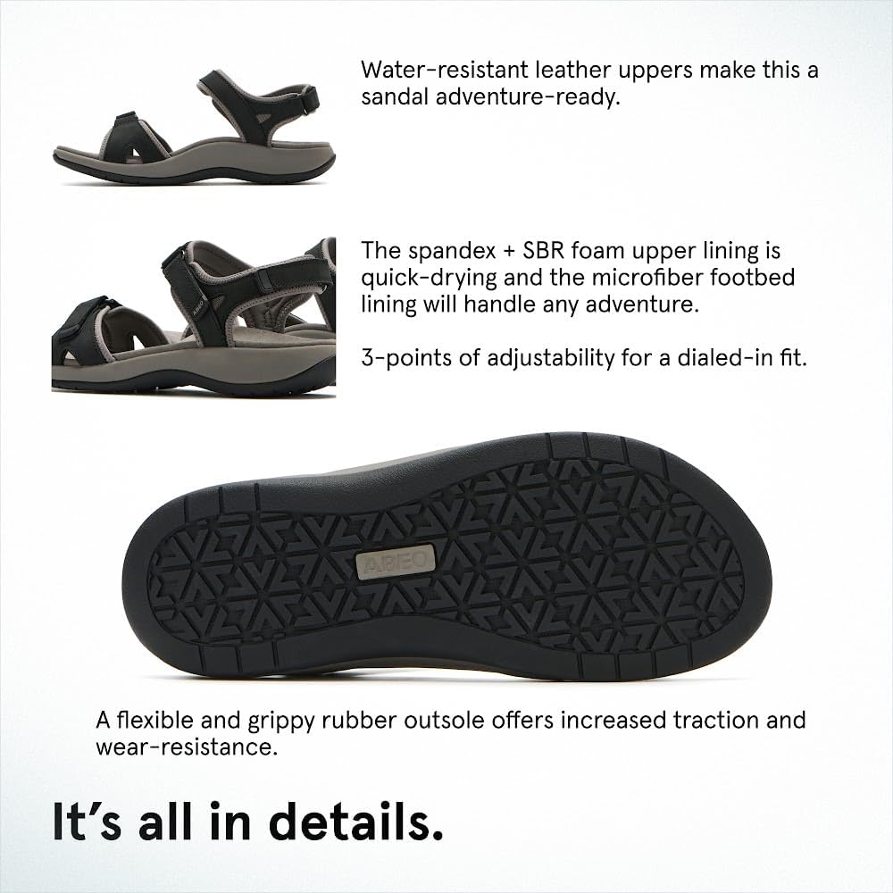 Built to support you on your outdoor escapades, the ABEO Goleta offers three points of adjustability to ensure a secure and customized fit. Our women's sandals are crafted with water-resistant leather uppers and our innovative BIOsystem orthotic footbed, promising superior arch and heel support with responsive cushioning. A flexible and grippy rubber outsole on these sandals for women offers increased traction and wear-resistance, ensuring you have the best hiking sandals for a variety of terrains. These strappy sandals are sure to be your next go-to for supportive footwear. Superior Arch & Heel Support - Exceptional arch support helps reduce pressure on joints by properly distributing weight and balance. Our cushioned deep heel cup helps absorb shock, preserve your natural heel pad, and properly align the body. Water-Resistant Leather UpperBuilt-In Orthotic Insole - Our exclusive active BIOsystem orthotic footbed delivers a perfect balance of anatomical support, responsive cushioning and balanced alignment for exceptional all-day comfort. 3 Adjustable Heel, Instep & Forefoot Straps Sturdy & Durable Rubber OutsoleHelp Relieve Foot Pain & Fatigue Ergonomic cushioned soles soften steps to help foot and heel pain. Deep heel cup helps stabilize feet and align the body to minimize fatigue. Wider fit offers more room for wide or swollen feet. Help Alleviate Common Foot Conditions Plantar fasciitis: Weight balancing arch support and cushioned heel cup reduce shock to help relieve plantar fasciitisMetatarsalgia: Metatarsal footbed option has built-in metatarsal pad to help with forefoot pain. Bunions/Morton's neuroma: Spacious toe box and added depth helps reduce pressure.