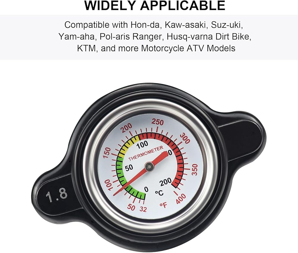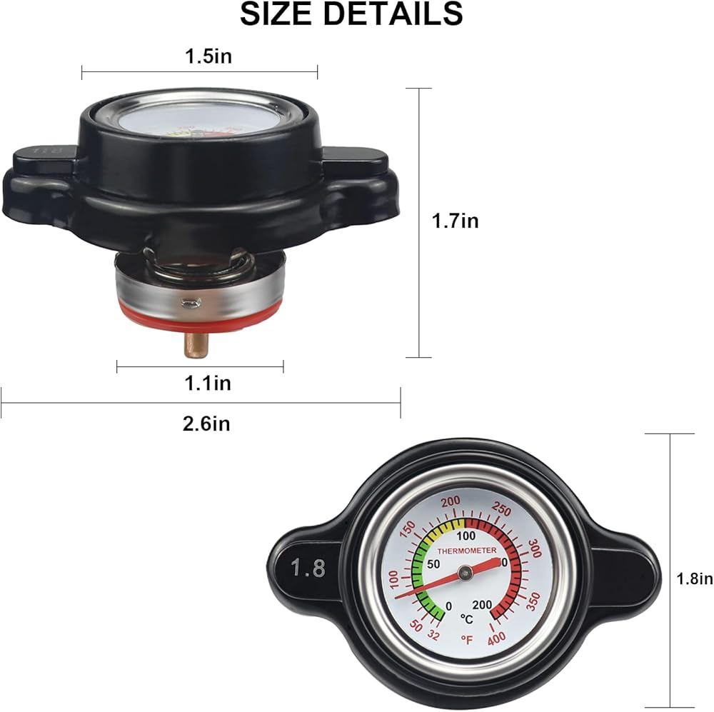 غطاء رادياتور 1.8 بار - يسمح لك غطاء الرادياتير عالي الضغط مع ميزان الحرارة بمراقبة درجات الحرارة في الوقت الفعلي بسهولة ويوفر قراءات دقيقة في كل من الدرجة المئوية والفهرنهايت مع نطاق 32-400 درجة فهرنهايت ونطاق 0-200 درجة مئوية. المينا الملون مرئي بوضوح ومراقبة درجة الحرارة متاحة على 2 أو 4 ضربات لمنع ارتفاع درجة حرارة المحرك