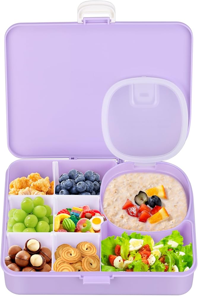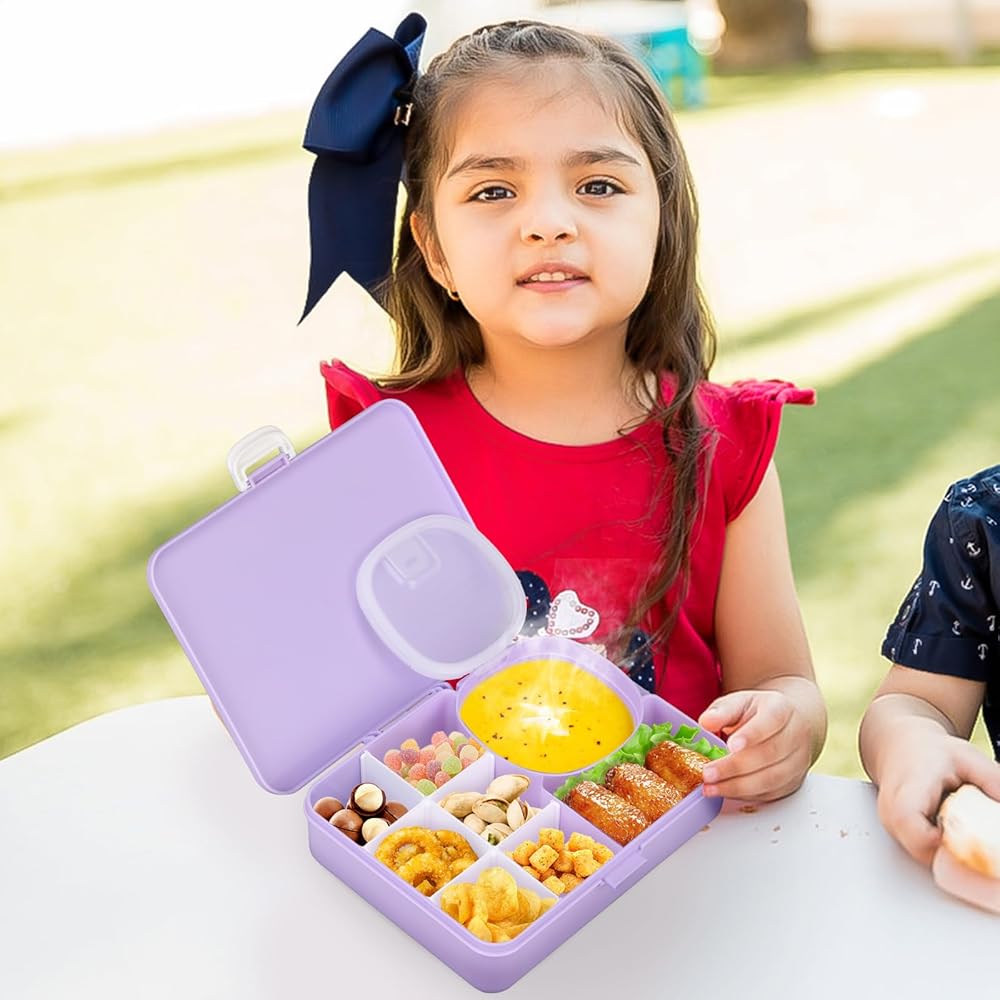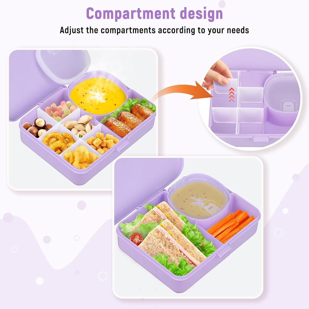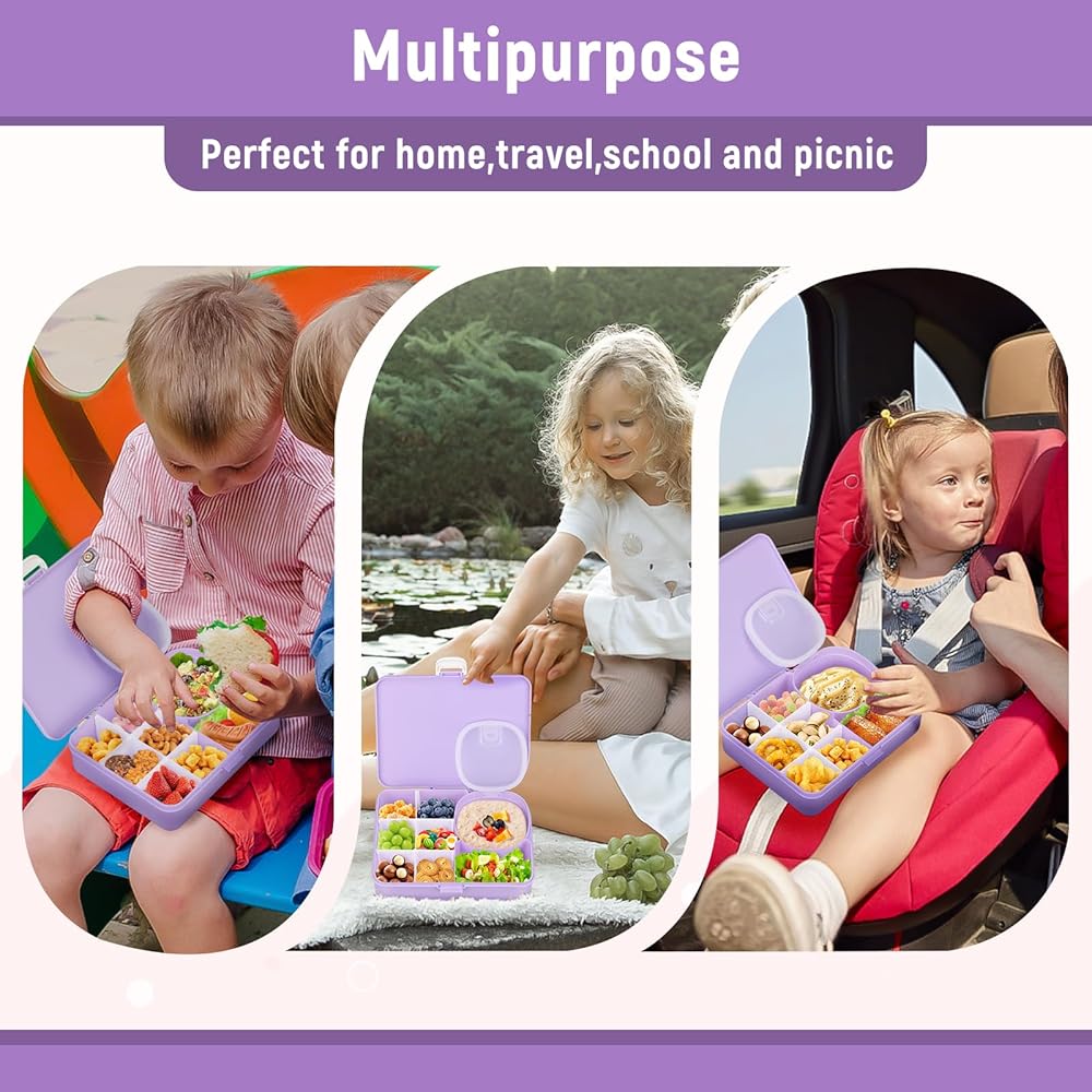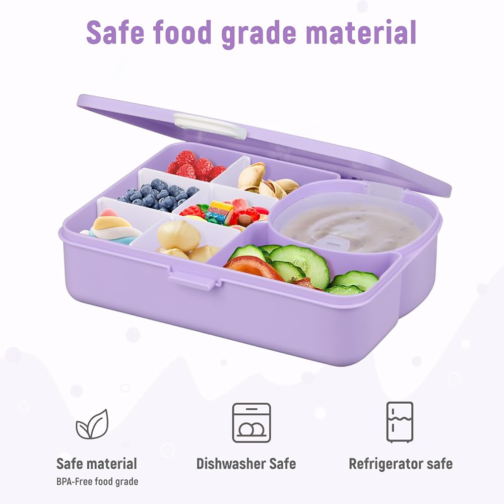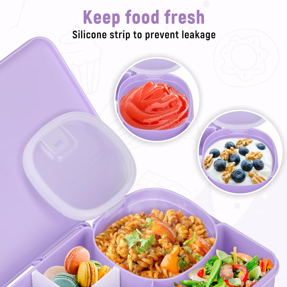 Sealing lid in the box: Unlike other products, our snack box has a compartment with a sealing lid, which is very suitable for yogurt, dipping sauces, and snacks in size and will not leak. Allow you to bring various types of food to make your child eat happily.
