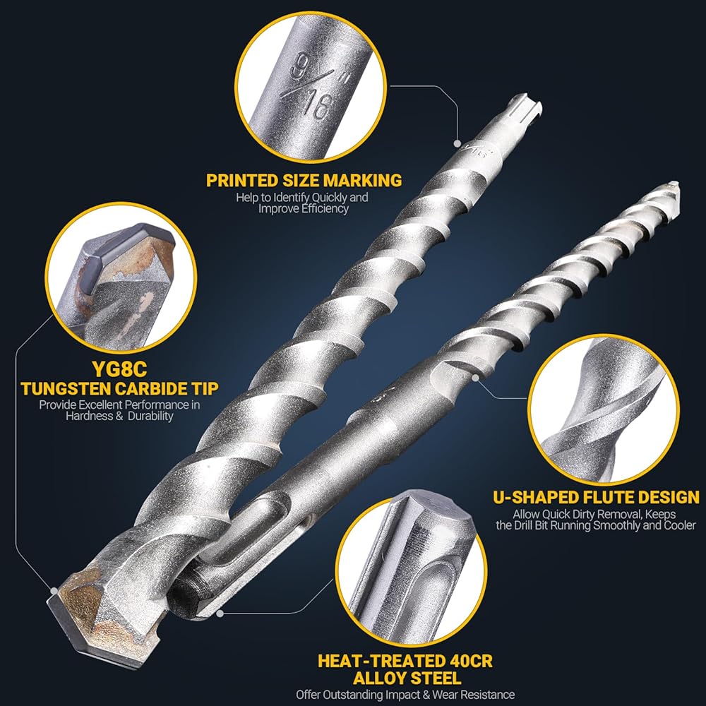 17-Piece SDS Plus Rotary Hammer Drill Bits and Chisel Set, YG8C Carbide Tips, SDS Plus Bits, Masonry Drill Bit Set for Concrete, Brick and Stone, with Storage Case, Ideal Tool for DIY, Home