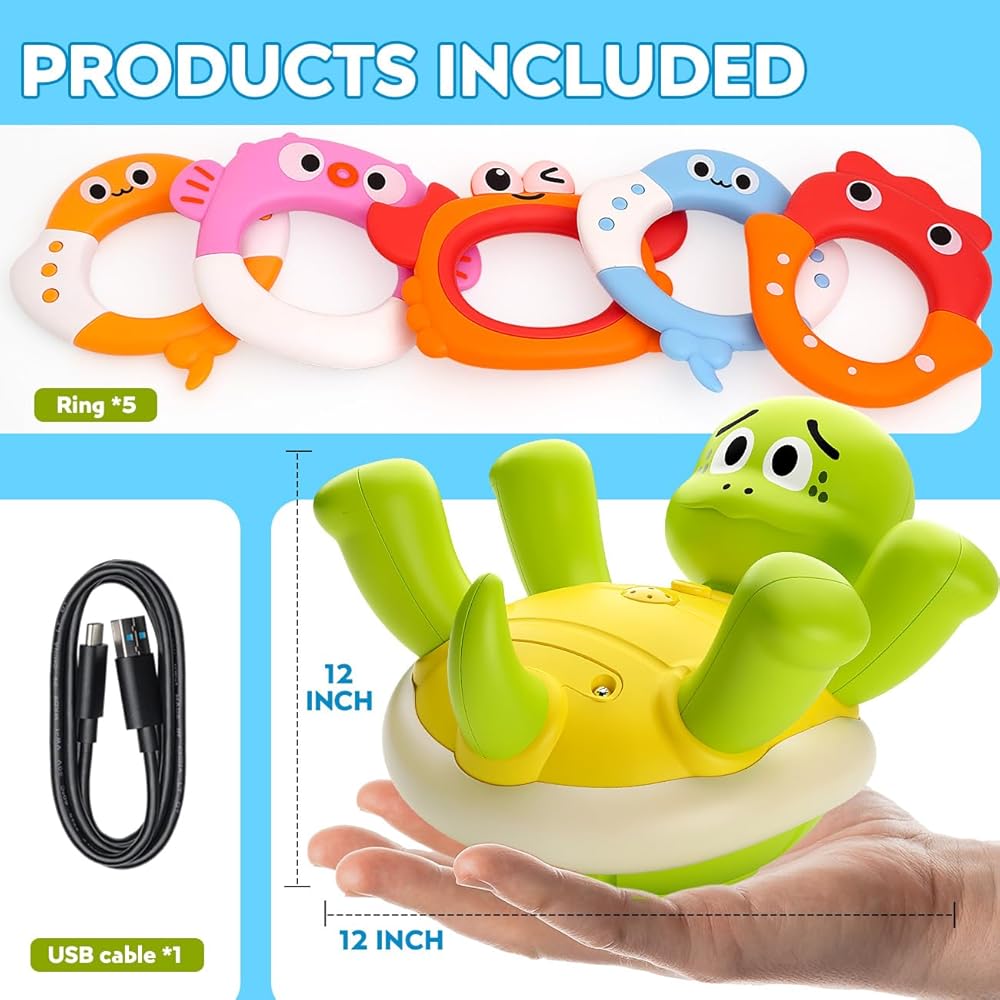 • ألعاب حمام السلاحف: تتضمن مجموعة حمام السلحفاة الرائعة 1* سلحفاة قابلة لإعادة الشحن (مع كابل USB) ، 5* حلقات ملونة لإلقاء ومكدس تشجع الأطفال على تعلم السبب والنتيجة. التصميم التفاعلي يبقي الصغار منخرطين ، ويحول كل غسل إلى وقت اللعب بهيجة. اجعل وقت الاستحمام مغامرة تعليمية رائعة!