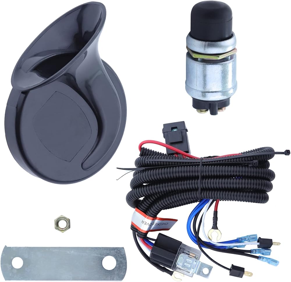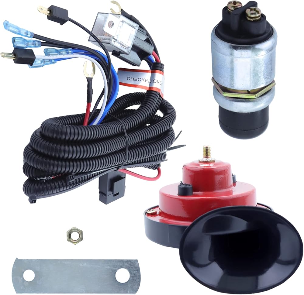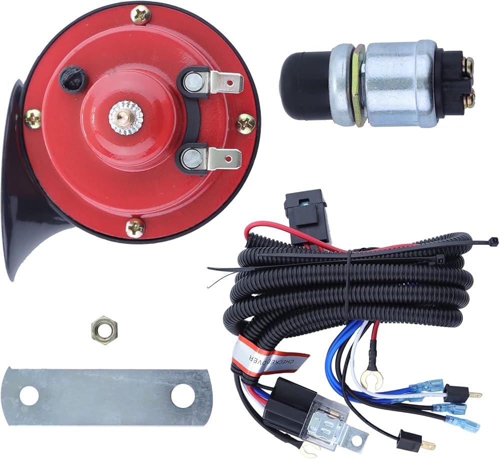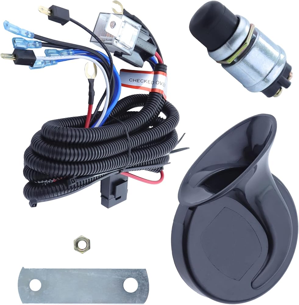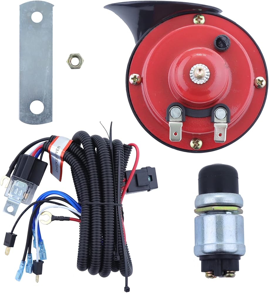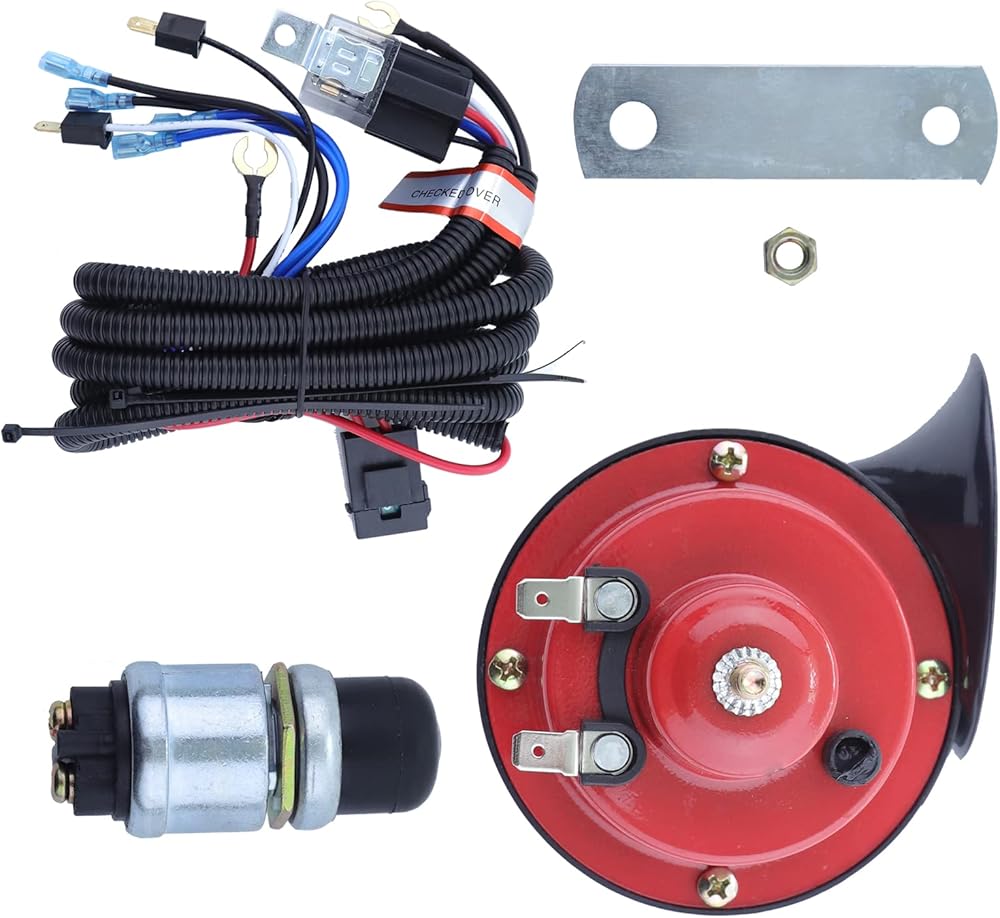 • Horn kit includes: Wire harness,Floor horn button,Two terminal 12v horn (4 inch Diameter),Mounting brackets.