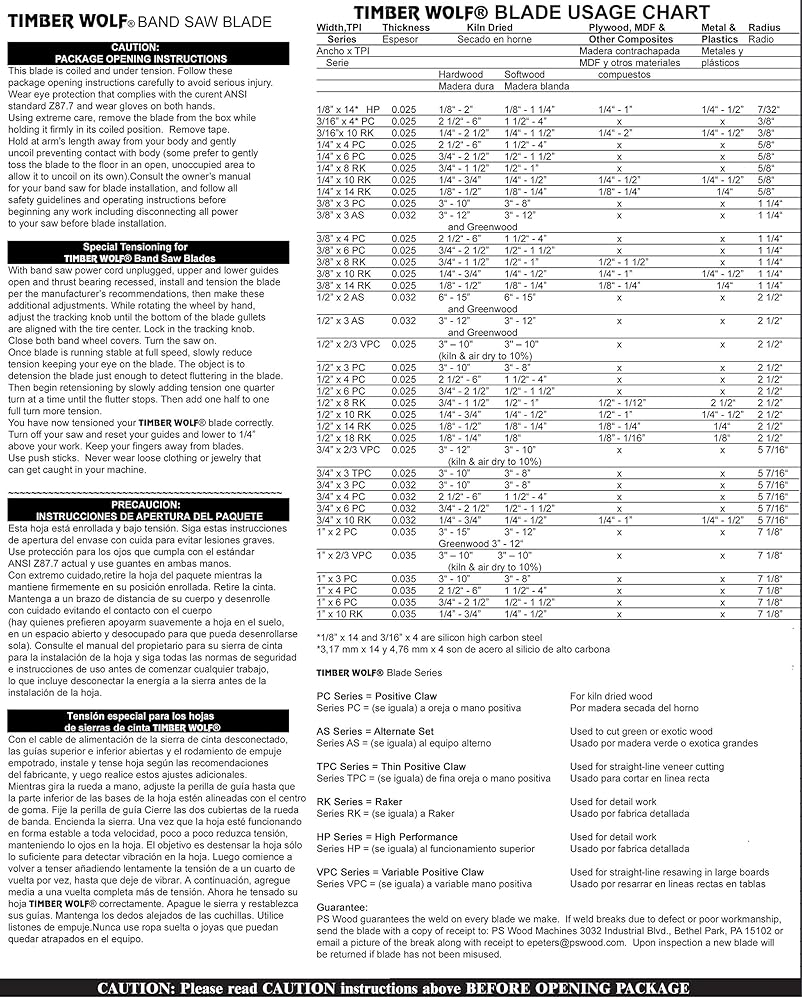 PS Wood Machines' Timber Wolf band saw blades run cooler, last longer and track true. Our 3/8” x 10 tpi x .025 blades are made of Swedish Silicon Steel. The teeth are induction hardened, milled for true tracking and produce a thin kerf. These blades run under a little lower tension which is better for your band saw. Our welds are warranted. The 3/8” x 10 tpi blades are used for gradual curves and straight-line cutting up to ¾” hardwoods and ½” softwoods. They can make a 1-1/4” radius cut. These blades give a smooth, clean finish for minimum sanding