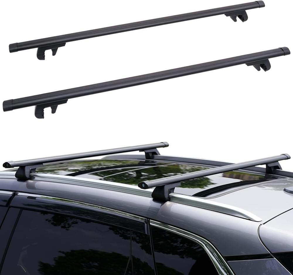 JUST-V 48 بوصة قضبان متقاطعة لرف السقف العالمي قابلة للتعديل بحد أقصى 46 بوصة من الألومنيوم المضاد للصدأ حتى 150 رطلًا من البضائع على السطح متوافقة مع القضبان الجانبية للسقف المرتفعة لحامل دراجة التزلج وأمتعة الكاياك باللون الأسود