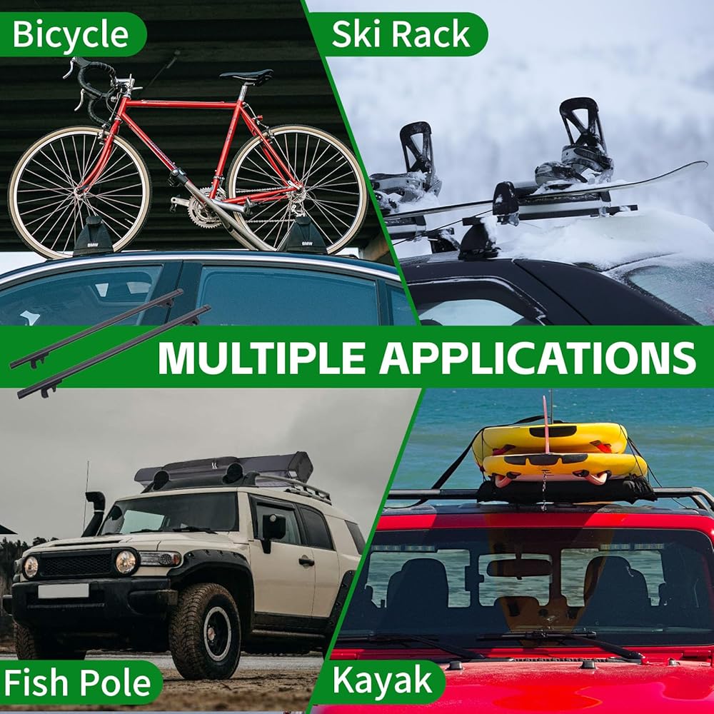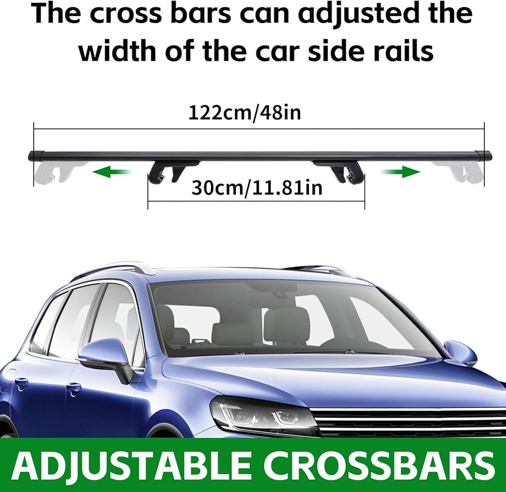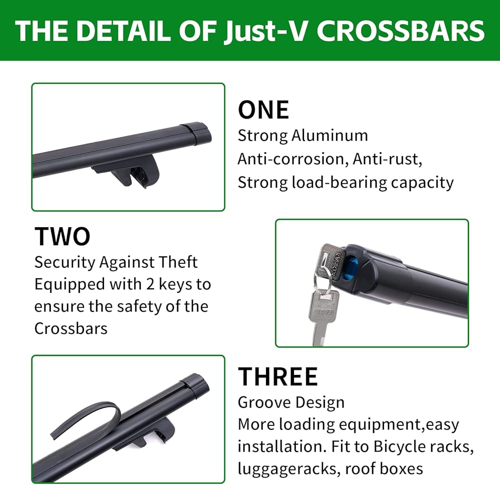 TWO-IN-ONE DESIGN - Adjustable roof crossbar has two screws to adjust the length of the two ends and the height of clamping the raised side rails. The JUST-V roof crossbar is more versatile and easy to install. The excellent design makes roof rack cross bar value fully play, and you feel better!