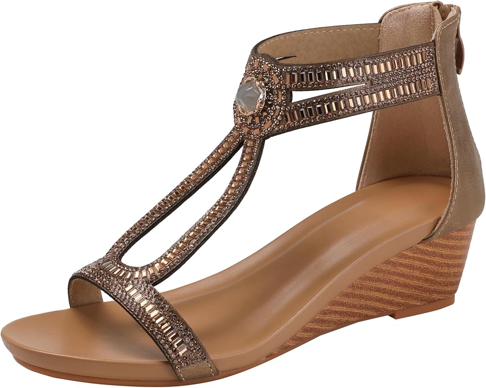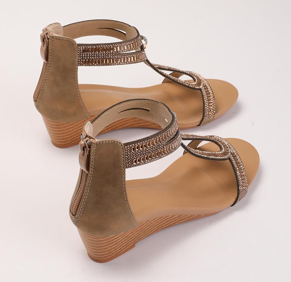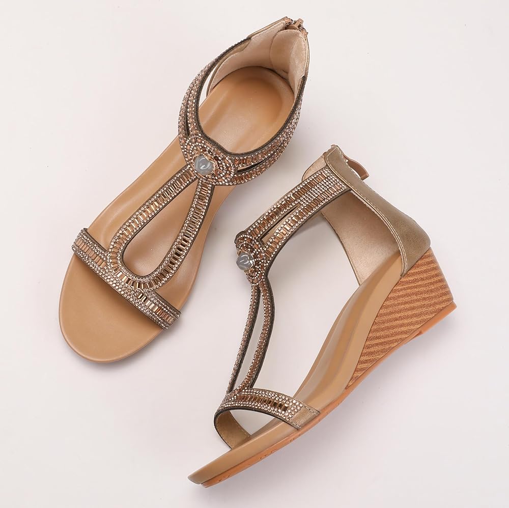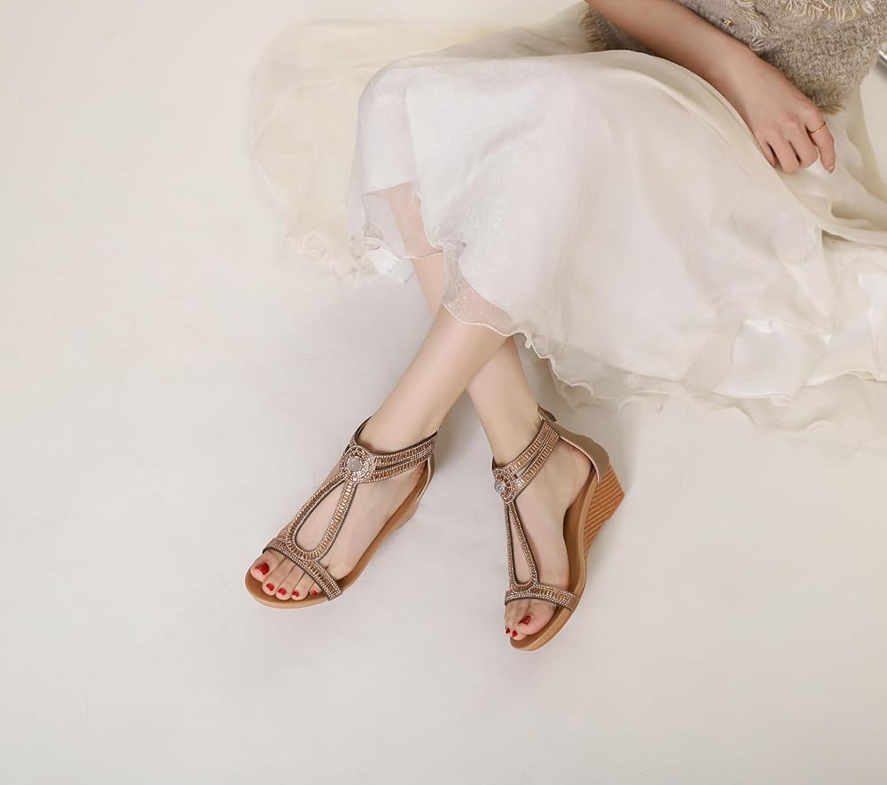 • 【الوظيفة المثالية】 صندل الإسفين في مجال راينستون للنساء المتلألئة تأتي مع نعل من اللاتكس ناعم مريح وتنفس ، وتصميم السوستة في الجزء الخلفي من الحذاء يجعل من السهل وضعه وإقلاعه ، ويحافظ قطع حزام إصبع القدم المفتوح على هدوء وجفاف طوال اليوم.