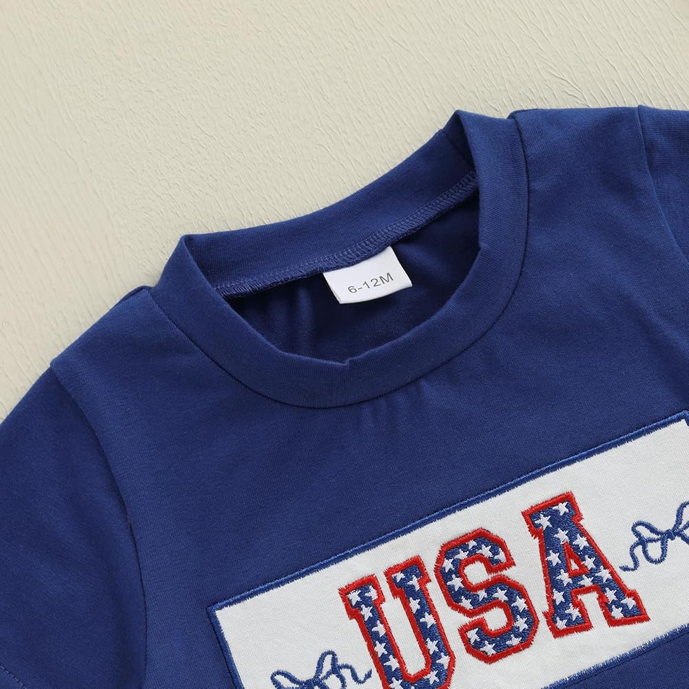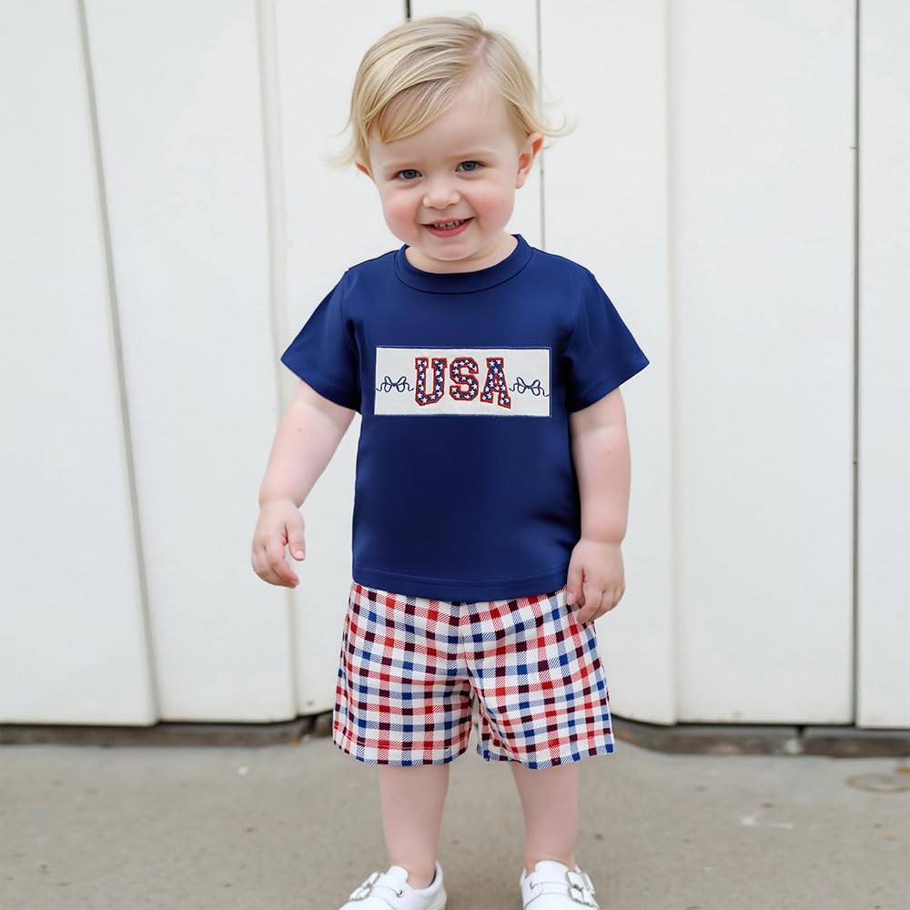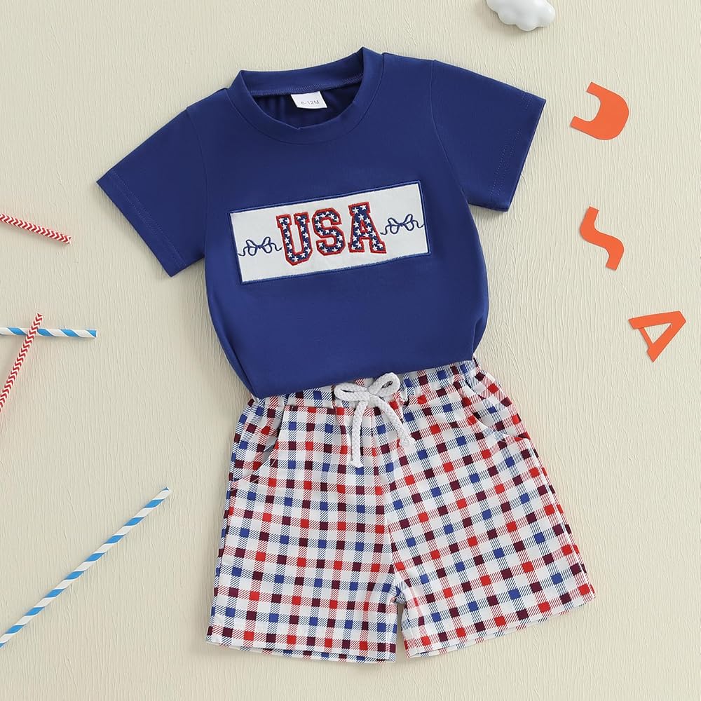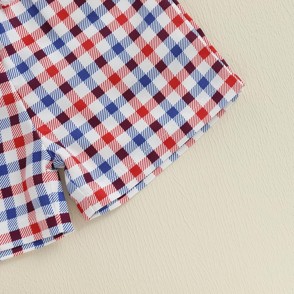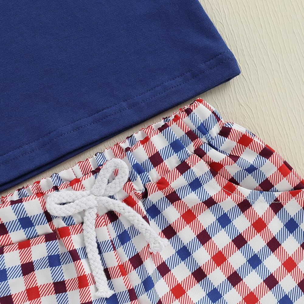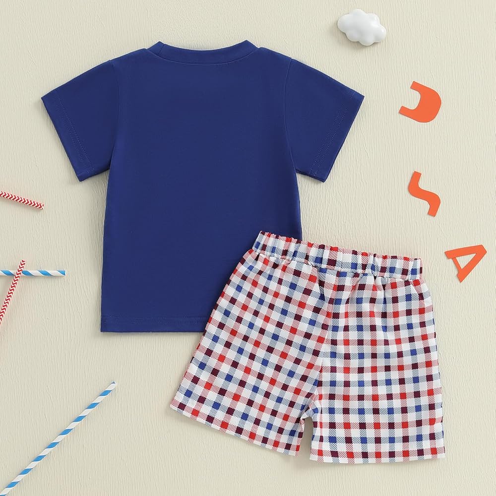 Baby 2-piece Outfit, Short Sleeve Crew Neck Embroidery Letters T-shirt with Plaid Shorts 4th of July Clothing