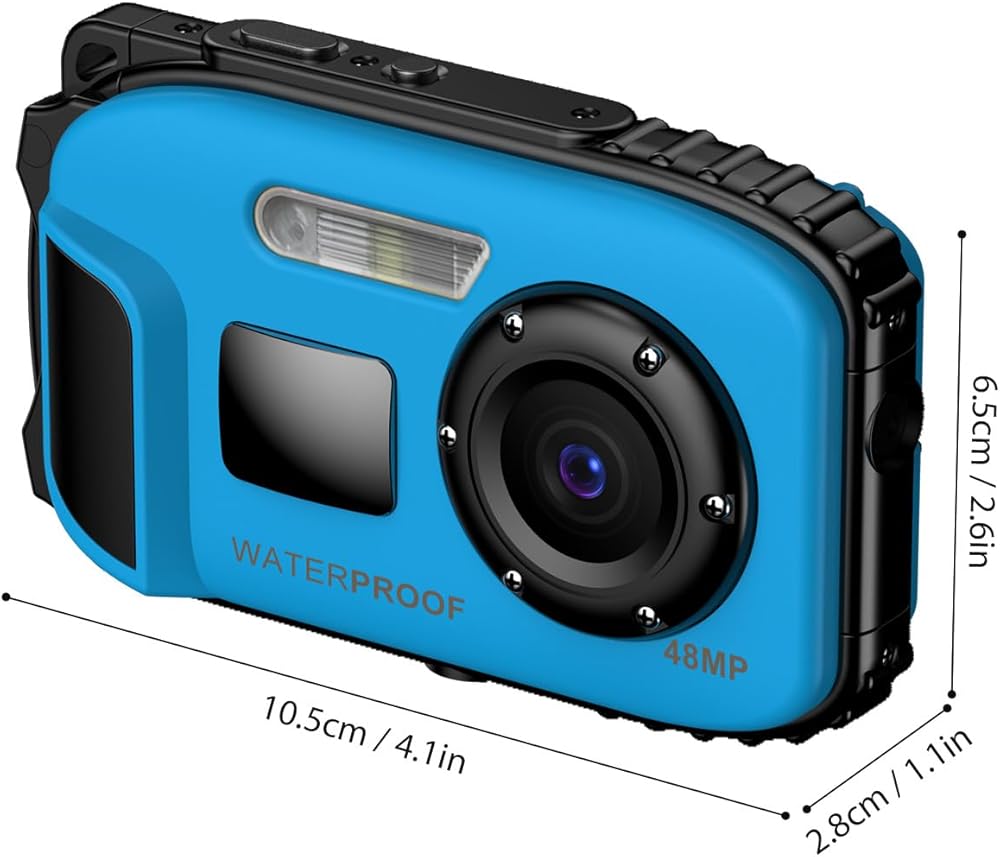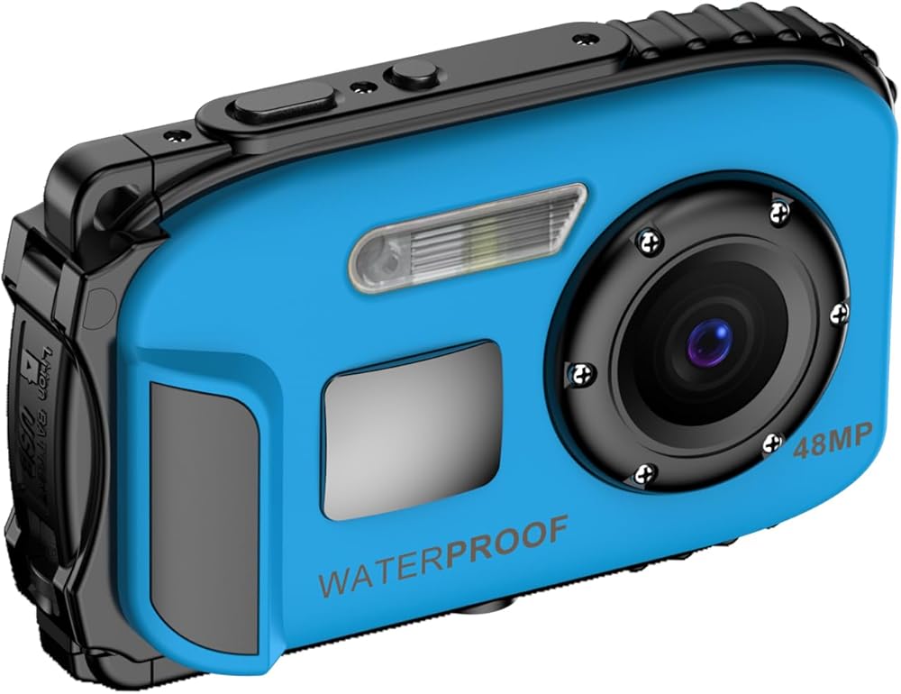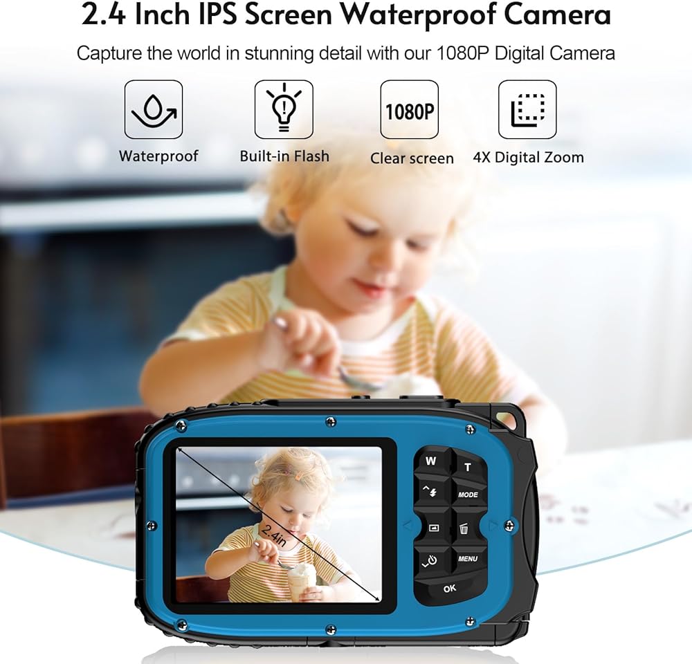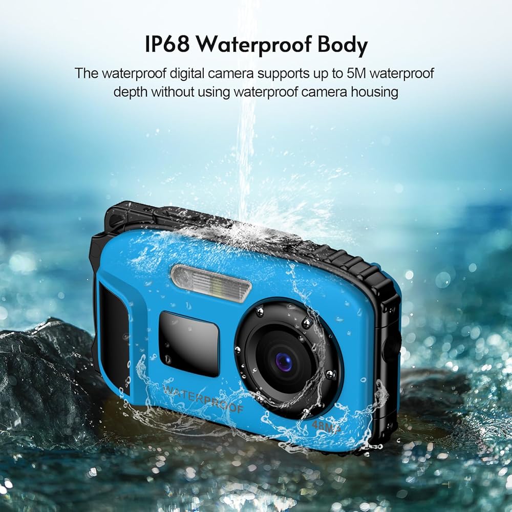 Andoer 1080P Waterproof Digital Camera 48MP Digital Video Camera 2.4 Inch IPS Screen IP68 5M Body Waterproof Depth Auto Focus 4X Digital Zoom Built-in Battery Birthday Festival Gift for Kids Boys Girls Students Teens