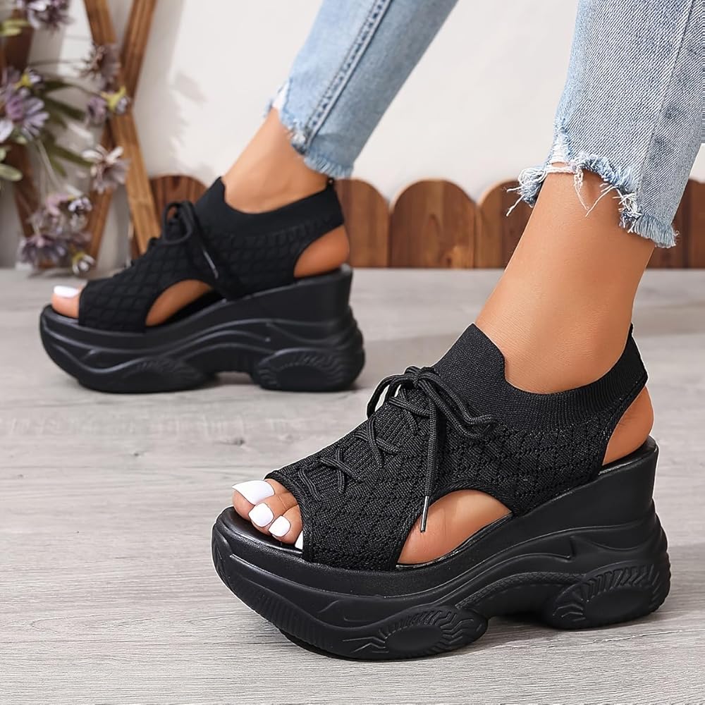 Elevate your summer look with a sleek black-and-white color palette and a trendy platform heel. The peep-toe and cut-out details add a touch of sophistication, perfect for beach vacations or casual outings