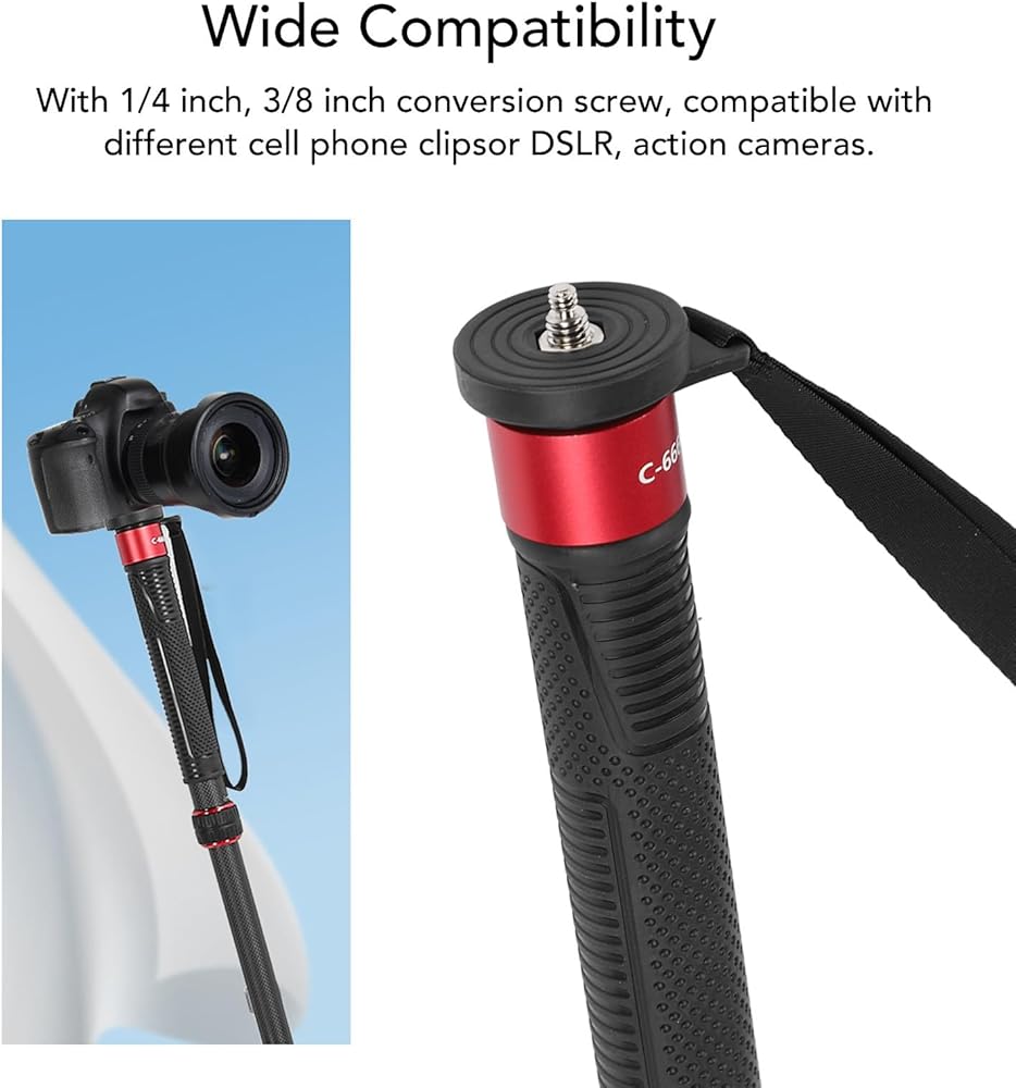 Wide Compatibility: Equipped with 1/4 inch and 3/8 inch conversion screws, this monopod is compatible with various DSLR, action cameras, and cell phone clips, making it a versatile choice for photographers.