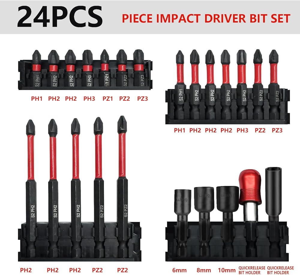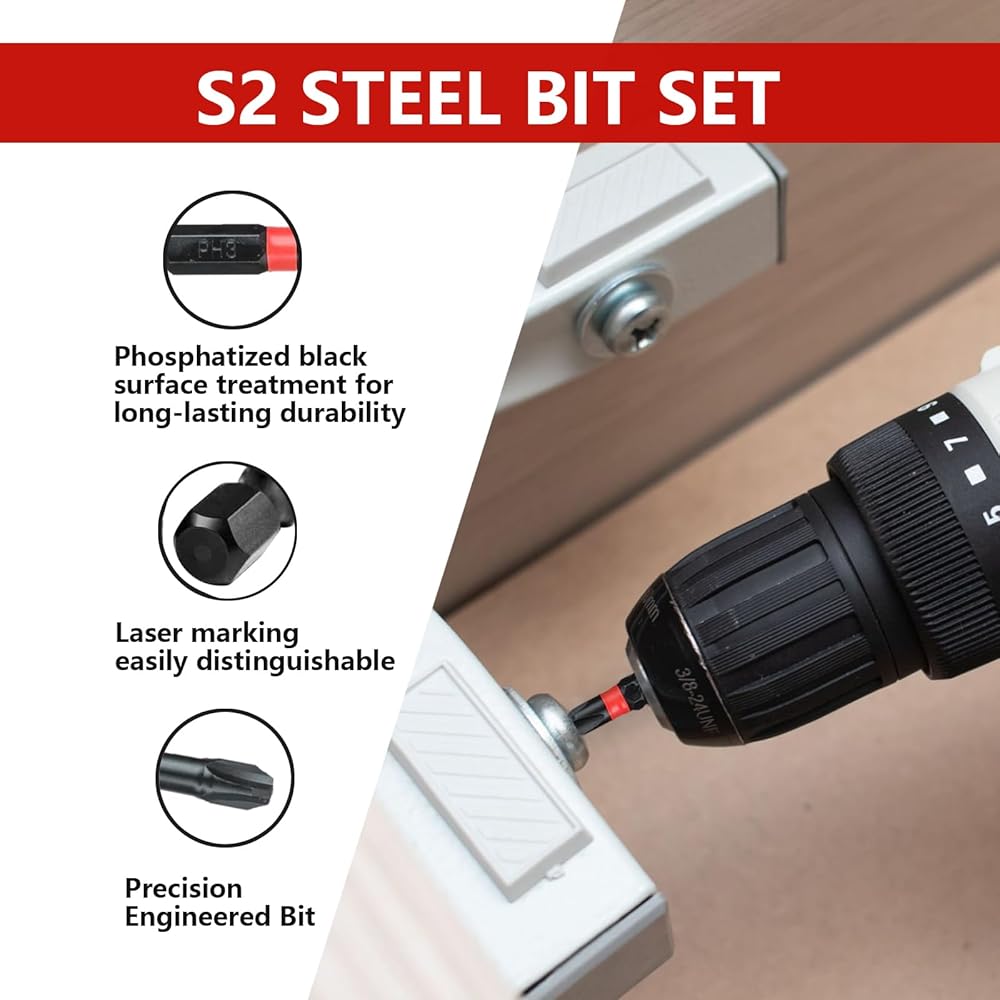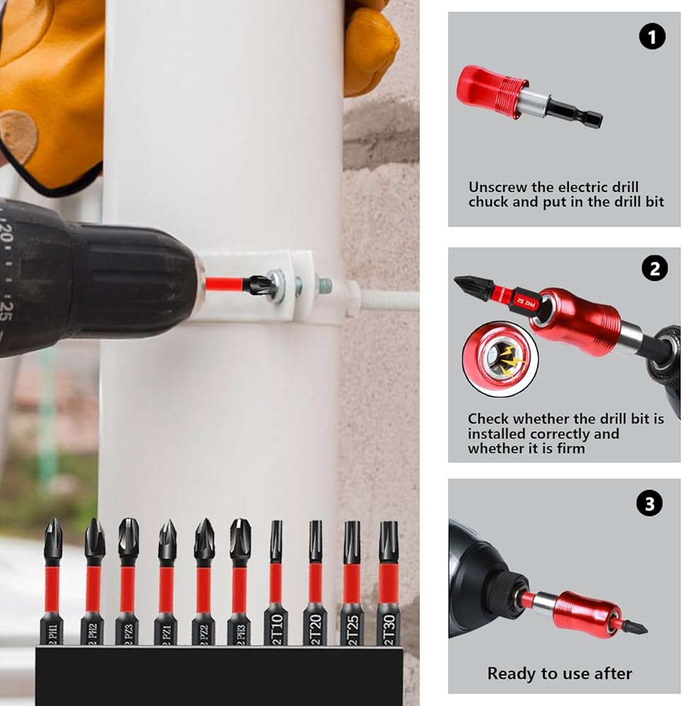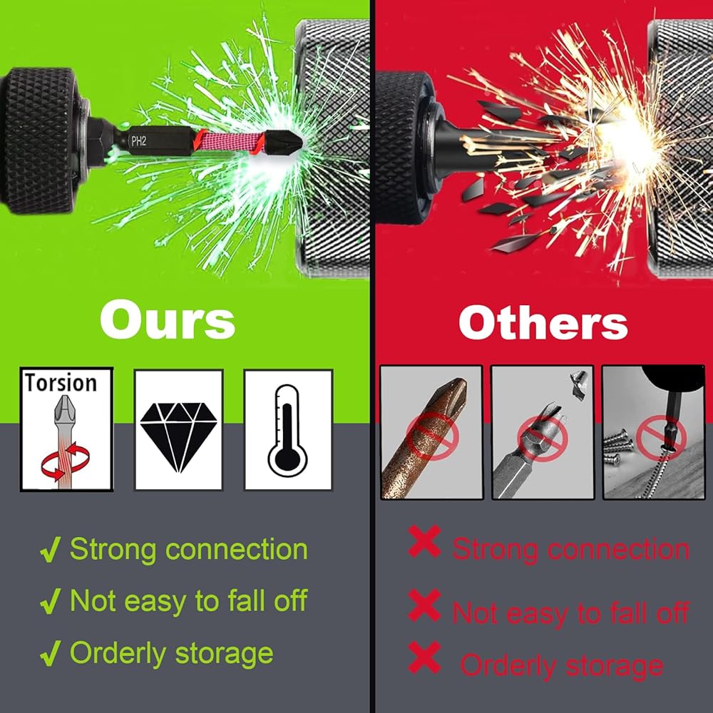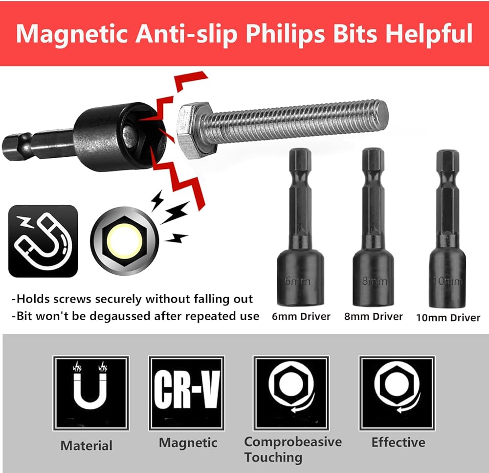 بتات حفر التأثير المغناطيسي المحسّن: تتميز بتات الحفر التي تحتوي على مغناطيسات قوية مضمنة في الداخل لالتقاط البراغي بسهولة ، وتبسيط سير العمل الخاص بك. مصممة للاحتفاظ بالقوة المغناطيسية خلال التطبيقات المتكررة. أدوات بت مفك البراغي المتعددة: تتضمن مجموعة متنوعة من الرؤوس المتقاطعة والرؤوس المرسومة ورؤوس Torx ورؤوس مربعة ورؤوس سداسية وأحجام أخرى.