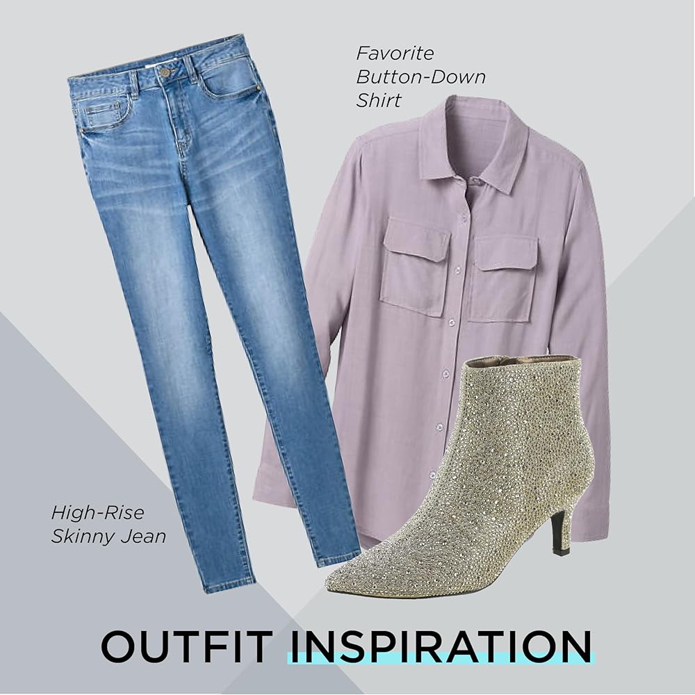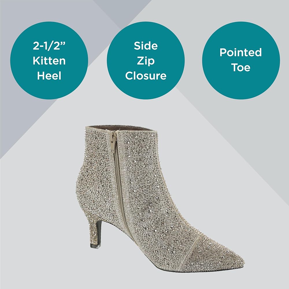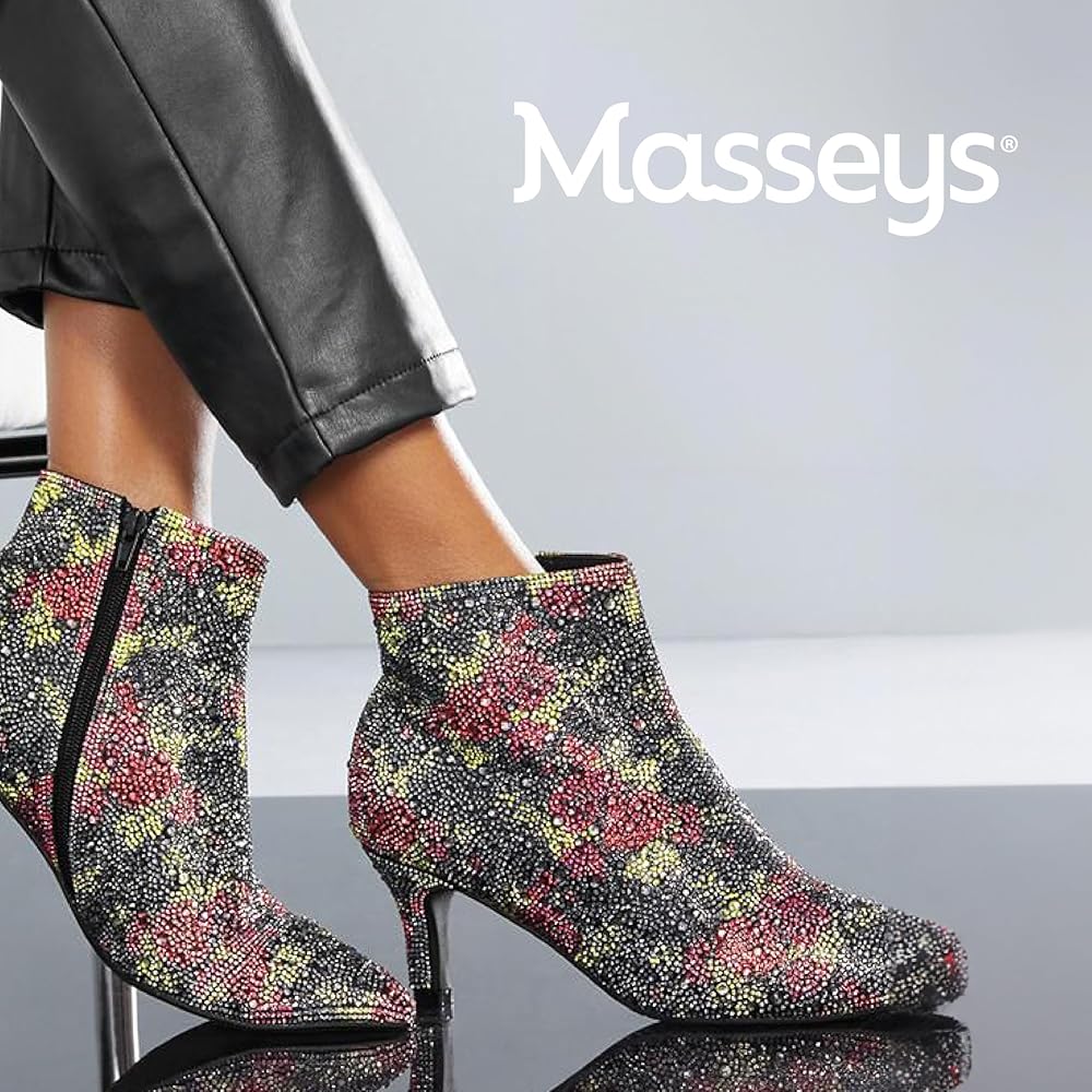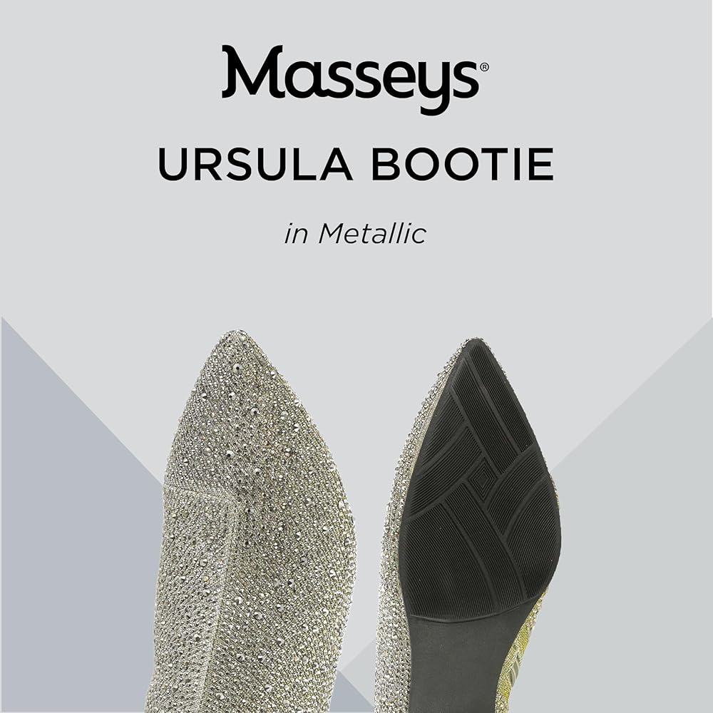 Massey Women's Ursula Rhinestone Studded Dress Bootie is a timeless fusion of standout style and comfort. This bold take on booties features a jewel-encrusted synthetic upper, pointy toe, and side zip closure. A flexible rubber sole provides stability, while the lightly cushioned footbed supports the 2-1/2” heel, ensuring all-day comfort. Pair these Ursula boots with a sweater dress and tights for date night when the temperatures dip or with slim pants and a jean jacket to elevate a more casual look. These embellished boots are a wardrobe staple, offering a timeless style that suits both dressed-up and more casual ensembles. Their bold look gives them an edge, making them versatile for numerous occasions and personal styles. Unleash your unique style with Masseys, where you can explore the latest trends in clothing and shoes to express your true self confidently to the world.