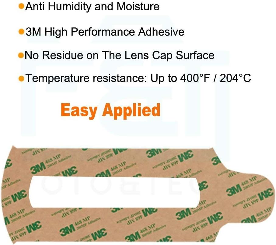 High Performance-- strong 3M adhesive, removable, no residue on the lens cap surface, anit humidity and moisture, 3M high performance adhesive temperature resistance up to 400 F