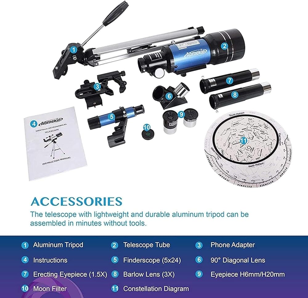 Accessories : 1.5X Erecting Eyepiece and 3X Barlow Lens Increase the Power of Telescope to Let Us Easier to Focus Moon and Stars, the Star Gazing Telescope Have Different Magnification for You to Choose. Smartphone Adapter Make It Easily to Observe with Cellphone. and the Star Target Planisphere Helps You to Know Various Stars.