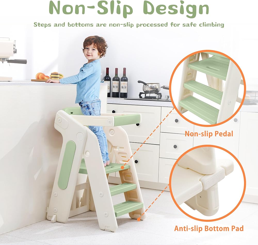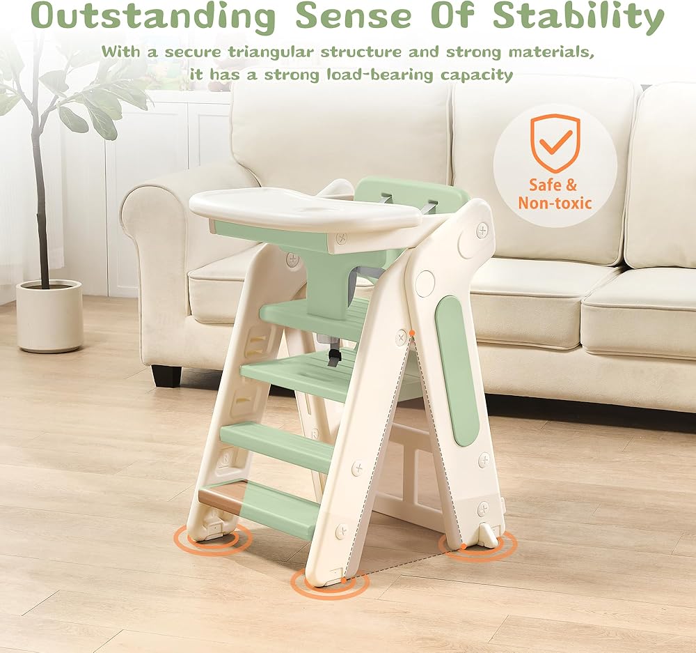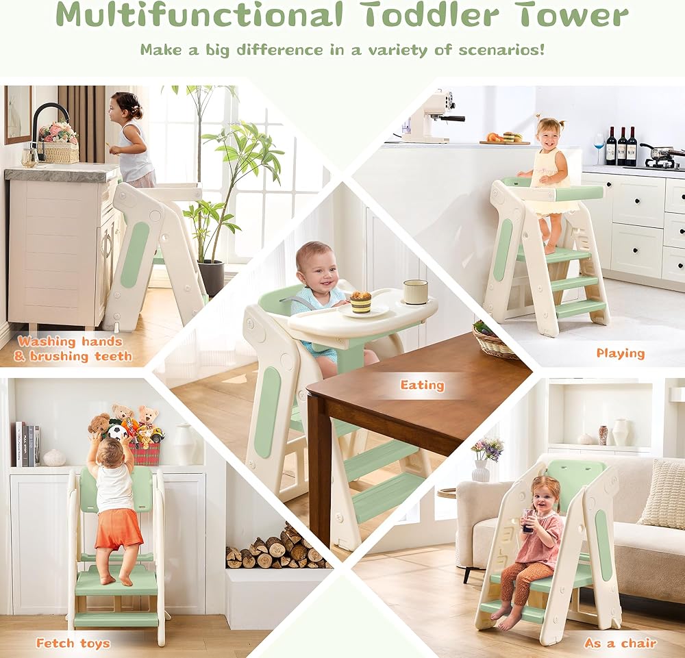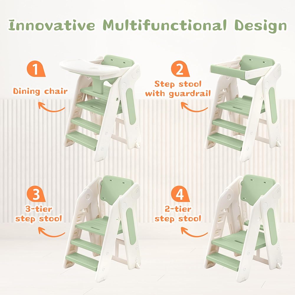 • براعة 4-in-1: لقد أضفنا وضع لوحة عشاء فوق البراز المعتاد حتى يتمكن الأطفال من تناول الطعام عليه. يمكن أيضًا استخدامه كبراز طفل صغير وثلاث مستويات. من خلال وضع سكة ​​السلامة العلوية ، يمكن تحويلها إلى وضع مع درجات مرة أخرى