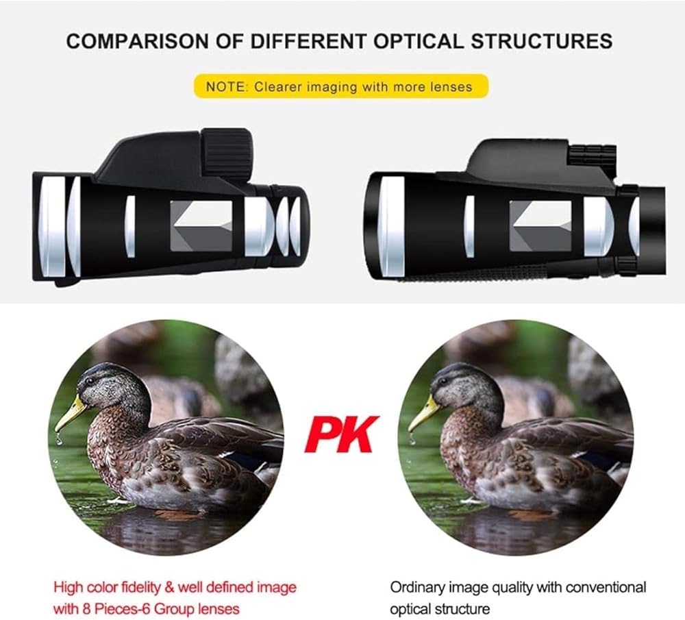 High Contrast and Resolution Images: long-lasting precision design featuring all glass high end optics, (BAK4 Prism & Multi-layer Film), this high power monocular telescope allows more light transmission and brightness and the light transmittance forming clear and colorful image
