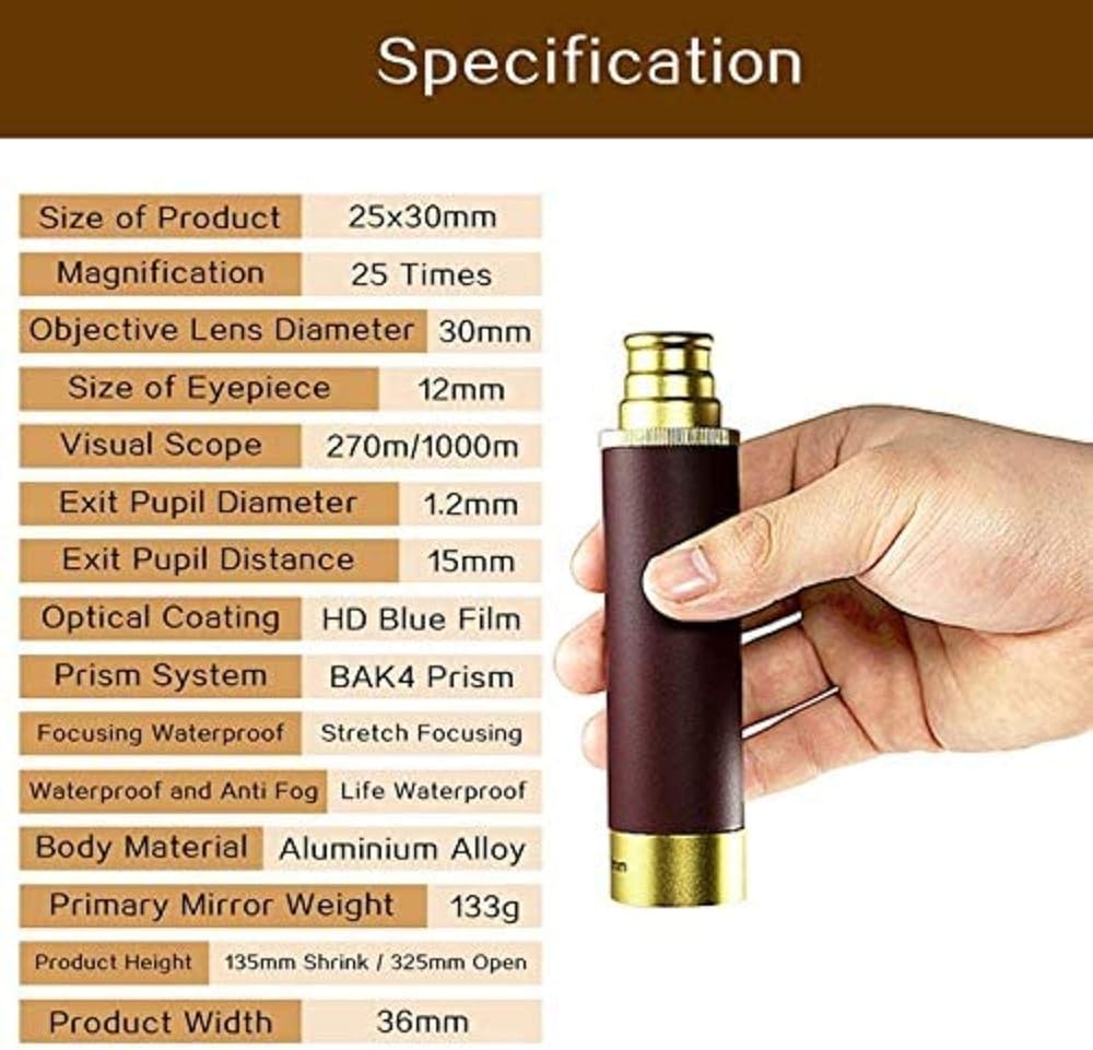 long-lasting and waterproof: The main components of the telescope are long-lasting metal structure and shiny brass surface. Its waterproof design can eliminate the trouble of rainy days, but please do not use it in heavy rain or immersion in water.