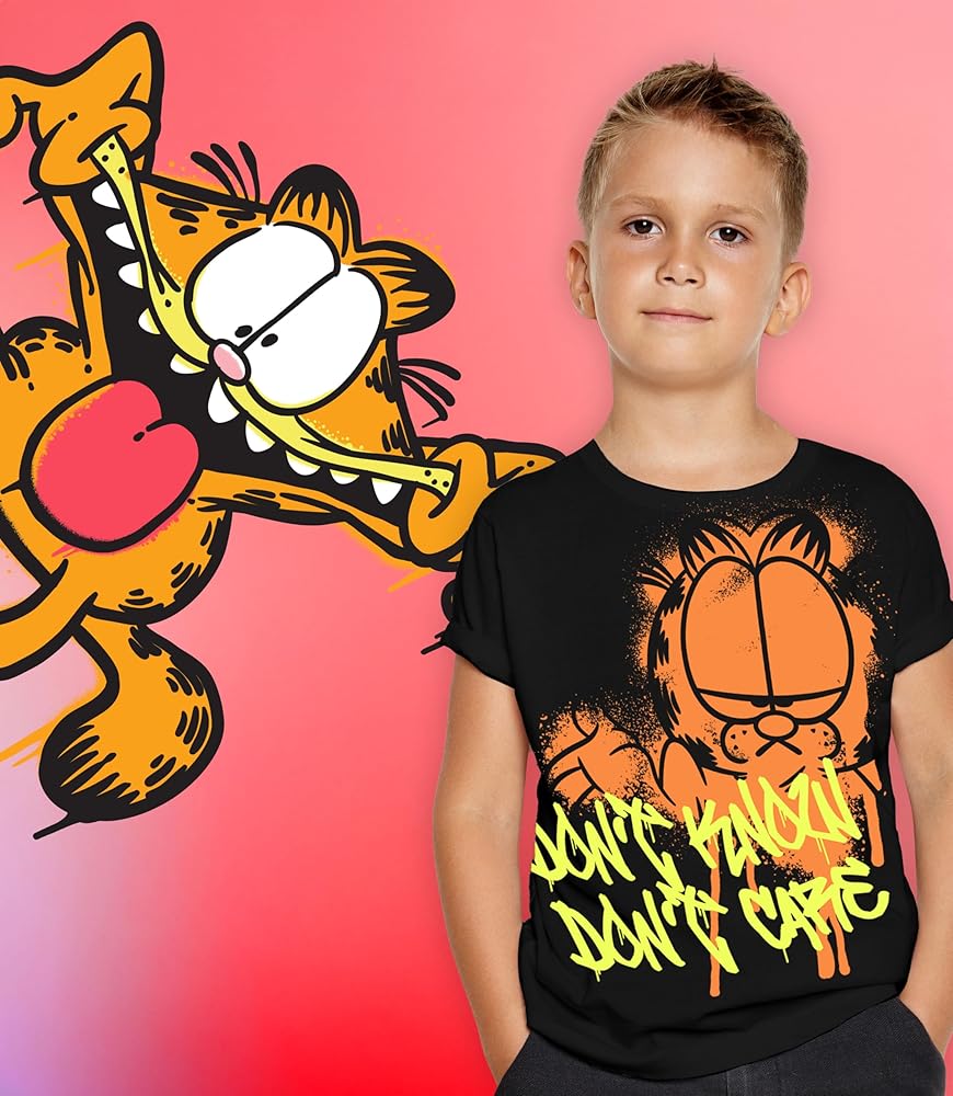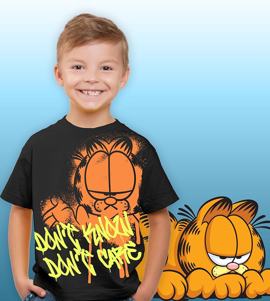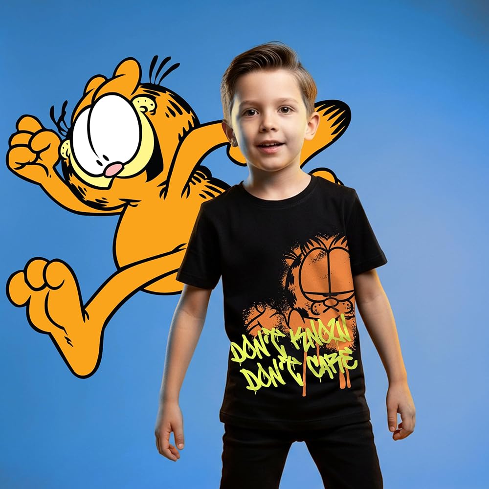 Bring The Iconic Lasagna Cat Charm To Your Child's Day. Finding clothes your kid actually wants to wear isn't always easy, but our Garfield shirts deliver. The bold split-style layout on a sleek black canvas adds a modern edge, giving kids a cool look they'll love. Whether it's for a day at school, playtime at home, or a casual family outing, this boys T-shirt brings fun and personality to their everyday wardrobe. Comfort Kids Will Love, Quality Parents Can Trust. Kids are always on the move, and their clothes need to keep up. That's why our Garfield shirts are made with a soft, breathable cotton blend that feels great to wear and won't slow them down. It's lightweight, durable, and ready for anything—running around outside, lounging on the couch, or playing with friends. Plus, it's durable enough to handle frequent washing and wear, so you don't have to worry about fading or shrinking. It's reliable, easy care you can count on. The Short Sleeve Tee They'll Reach For Again and Again From the first time they put it on, this kids Garfield shirt will become a wardrobe favorite. It's the perfect blend of comfort, durability, and playful design, making it a shirt they'll want to wear over and over. For parents, it's an easy choice—stylish, long-lasting, and kid-approved. Say goodbye to morning outfit battles and hello to a Garfield outfit your child loves to wear every single time. A Nostalgic Favorite for Fans of All Ages Garfield's charm never gets old, and this Garfield kids shirt is the perfect way to bring his mischievous personality, and his lovable friends like Odie, Pooky, and Otto, into your child's wardrobe. Whether they're fans of the classic comic or meeting these iconic characters for the first time, this boy t shirt brings a nostalgic touch to everyday outfits or special occasions.