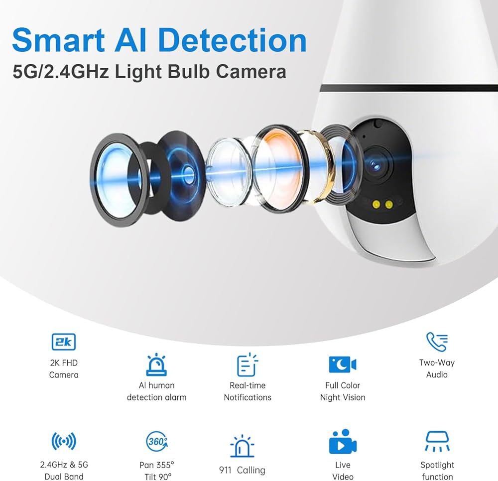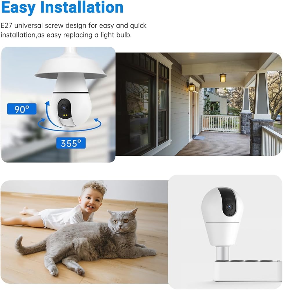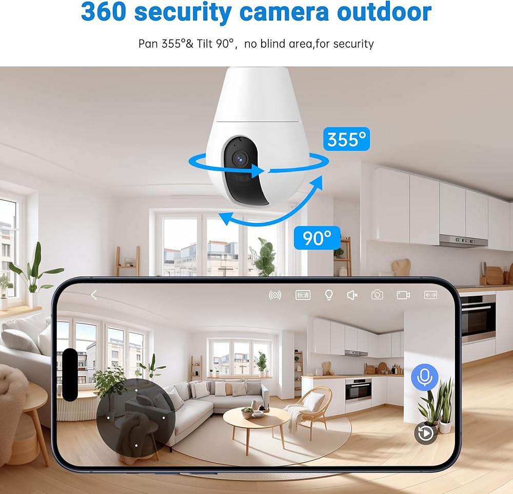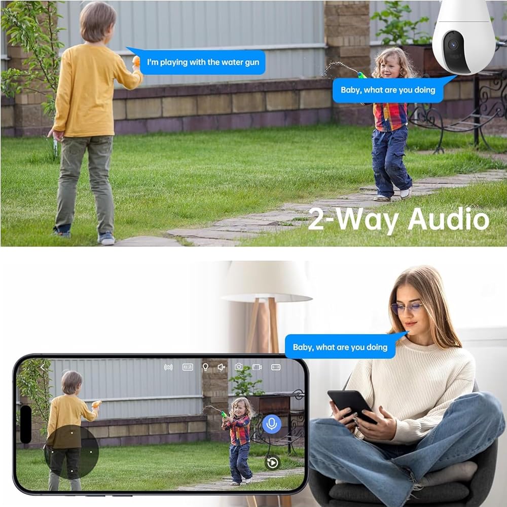 2K HD & 911 emergency call: light bulb camera outdoor 360 supports 2K 3MP HD image. Porch light cameras for home security ensuring you can see ultra-clear details both day and night with color/smart/infrared night vision mode. Our outdoor camera supports 911 emergency call activation when detecting unauthorized strangers. Upon detecting a person through AI-based stranger recognition, the system triggers alerts (e.g., siren, pop-up video) and allows users to manually initiate a 911 call via voice command or app. Once dialed, the camera automatically activates nearby surveillance to record the incident, ensuring accurate location data for emergency responders.