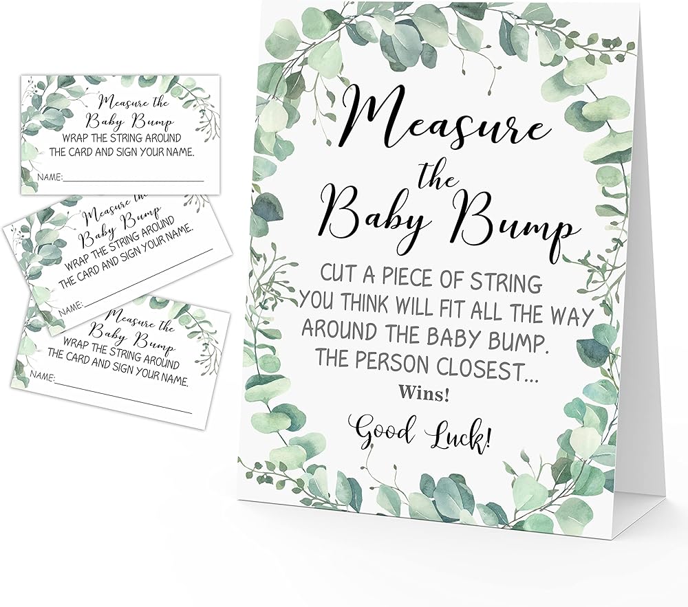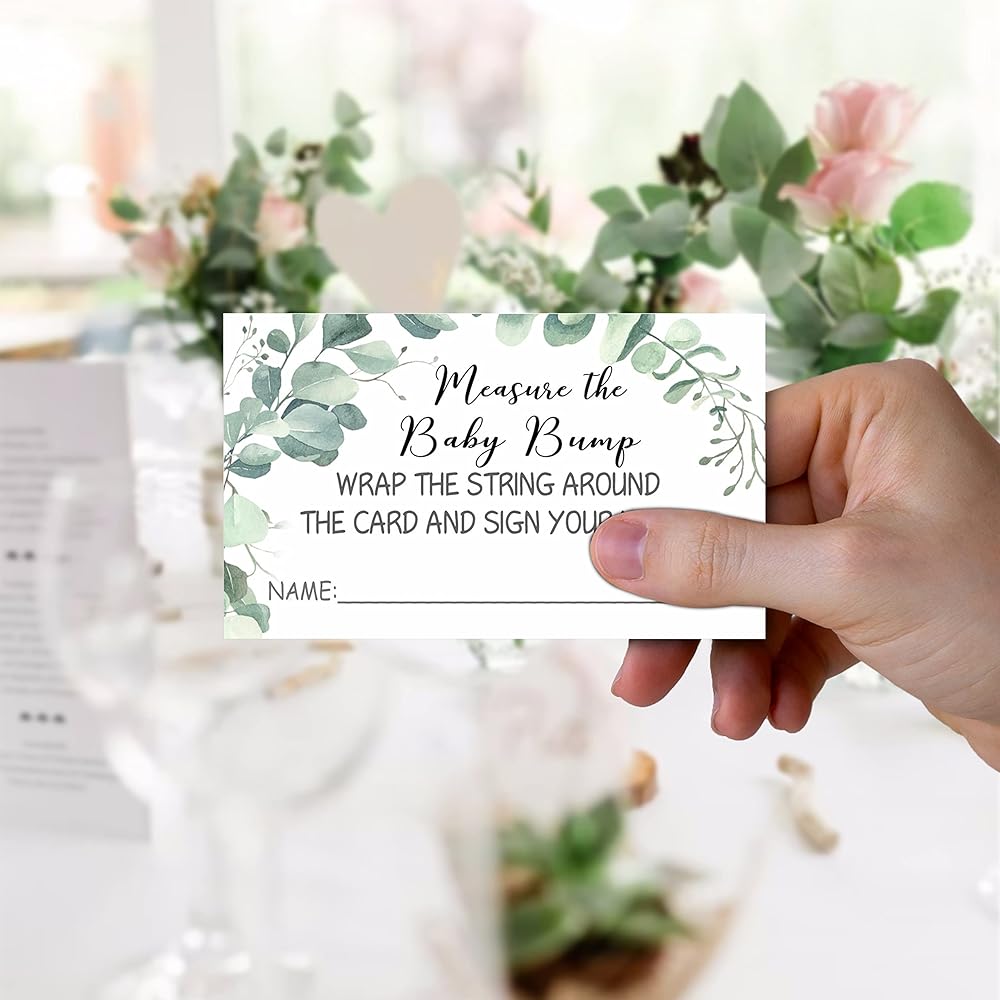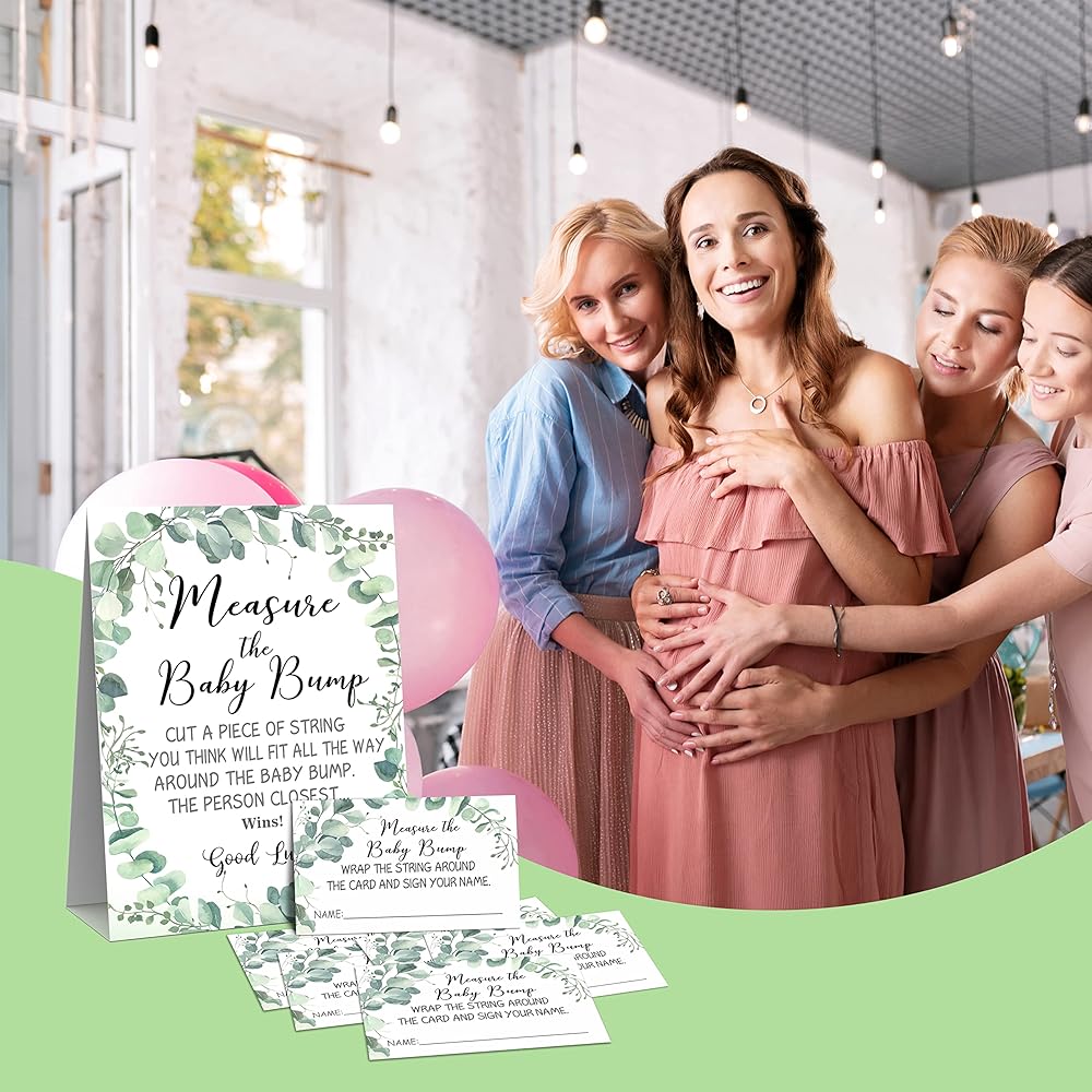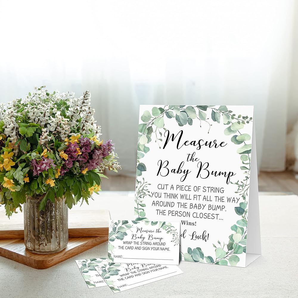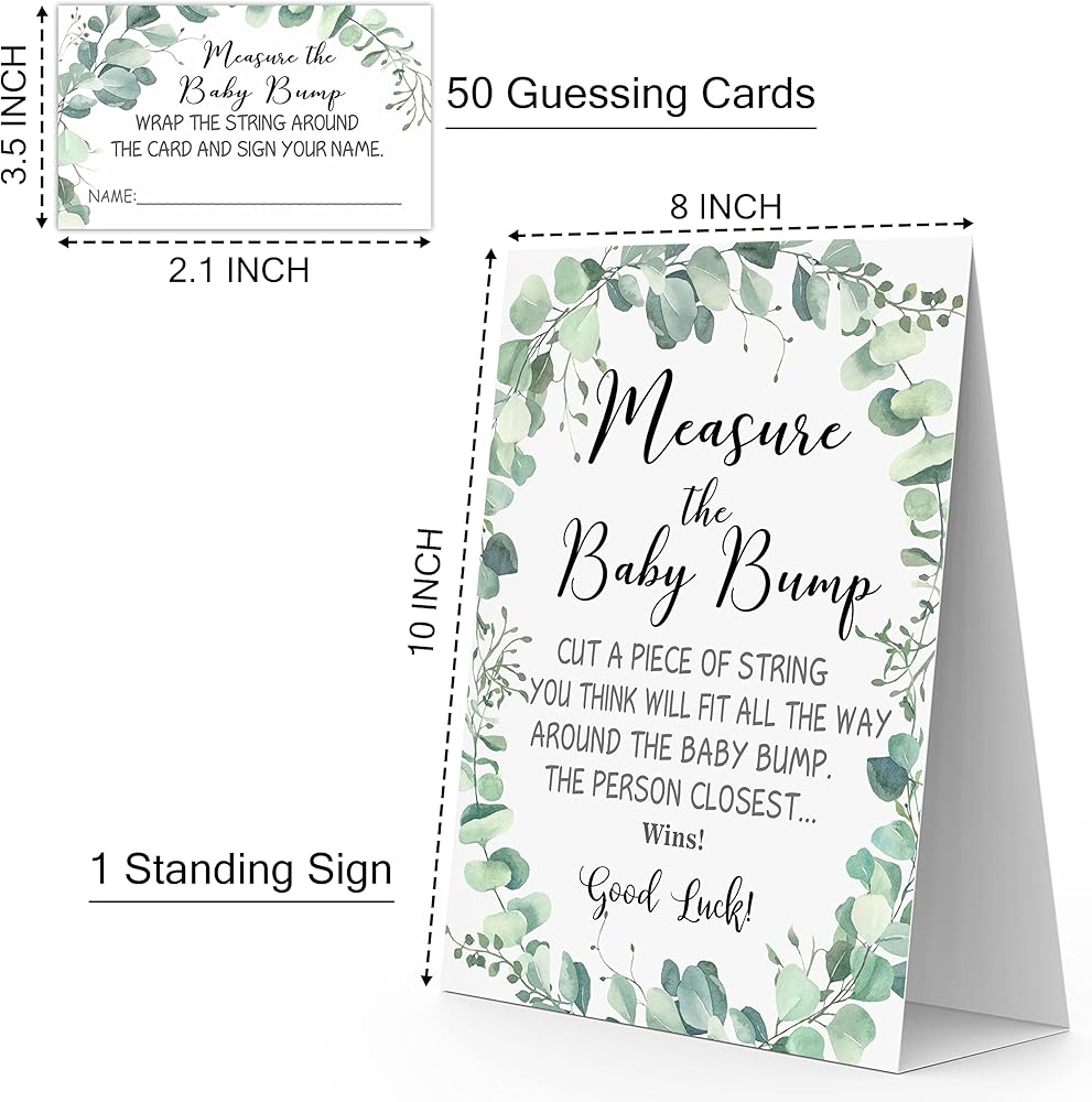 لعبة قياس بطن الأم، أخضر، موضوع الأوكالبتوس 1 لافتة و50 مجموعة بطاقات تخمين، قم بقياس نتوء الطفل، ما هو حجم لافتة طاولة بطن الأم، ألعاب حفلات استحمام الطفل - BUMP-a007
