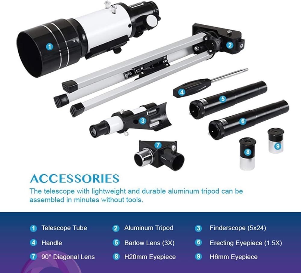• سهلة التجميع- لا توجد أدوات مطلوبة لتجميع مجموعة Telescope مع ترايبود الألمنيوم الخفيف ودائم معا في دقائق يمكن استخدامها.