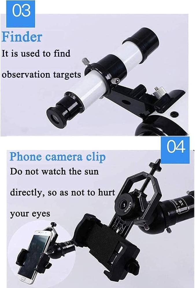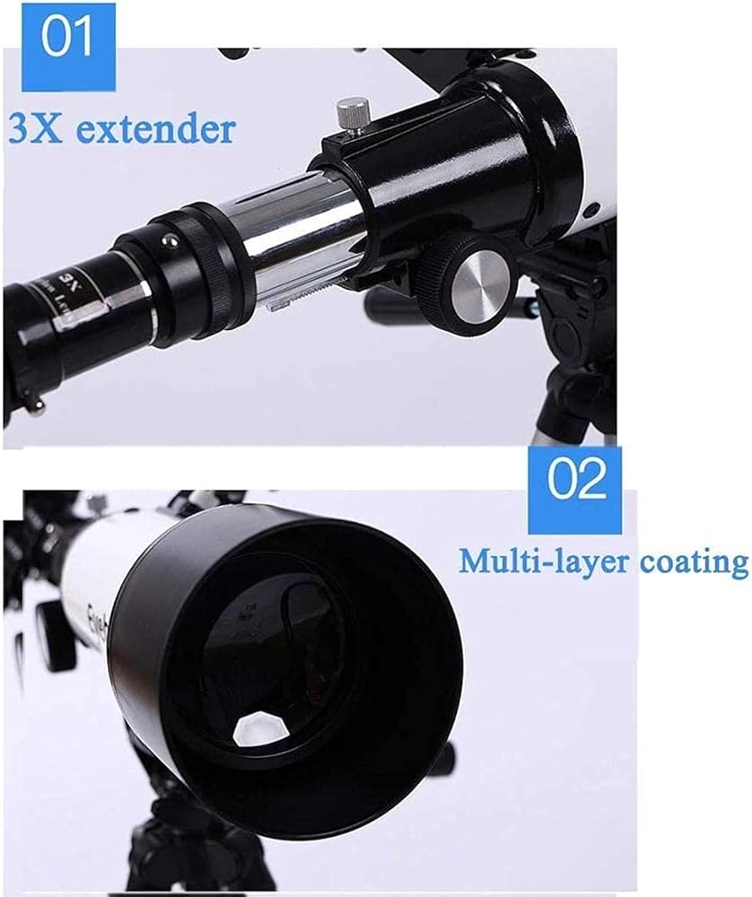 HIGH MAGNIFICATION: With a focal length of 400 mm,The telescope has a larger and more stable magnification,The 70mm large aperture objective lens makes the image brighter and clearer,realizing a large field of view. 3X extender,let you see more clearly and enlarge,see farther. with two replaceable eyepieces (K9mm,K20mm),so you must choose different eyepieces for different observations. Finder Scope can locate objects faster.;PORTABLE TRIPOD: The tripod is made of aluminum alloy,which provides a stable base,is very durable. Suitable for astronomers Beginners Observing the Moon,Stars,Birds,Looking at the Natural Landscape,Looking at Wild Animals outdoor stargazing.;PROFESSIONAL OPTICS: Full-surface multilayer lens with high transmission,improved brightness and sharpness of the images,it also protects the eyes even if used for a long time.;EASY TO INSTALL: A small refracting type telescope with a larger diameter (70mm),accounting for little place,lightweight and easy to carry.Your child can use it safely. Professional telescope with smartphone adapter,backpack and other useful accessories. It is one of the best scientific toys for children.suitable for entry-level amateur astronomers and children to explore land & sky,especially a best gift for your children.