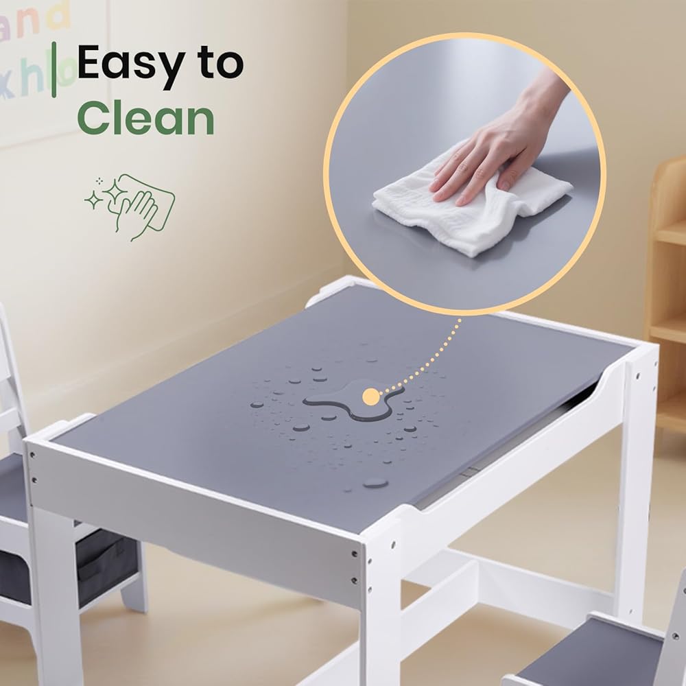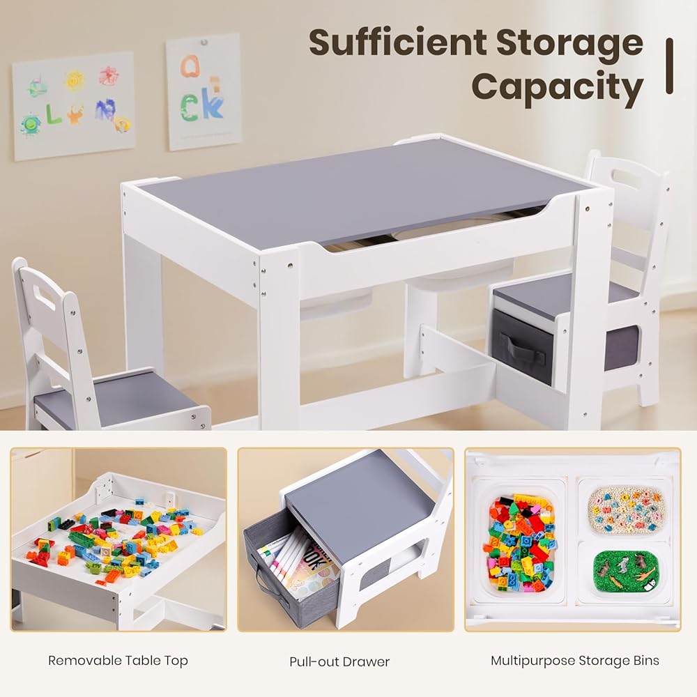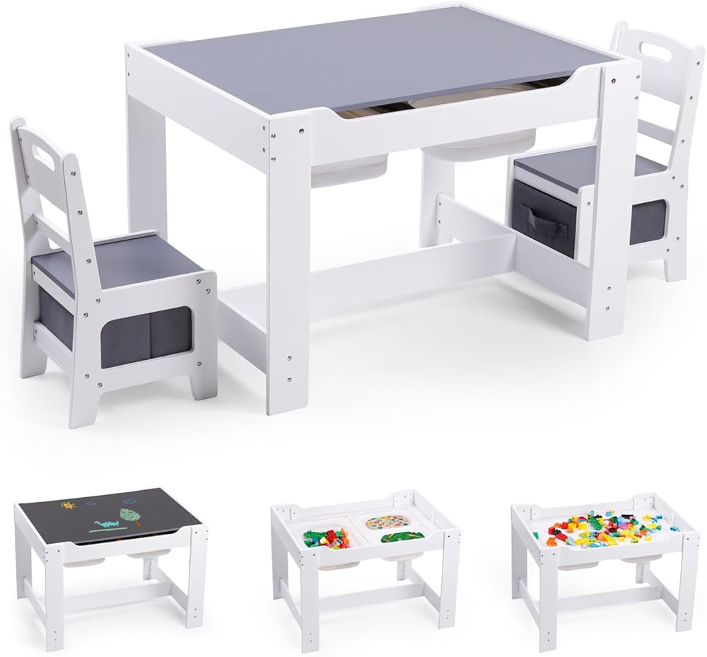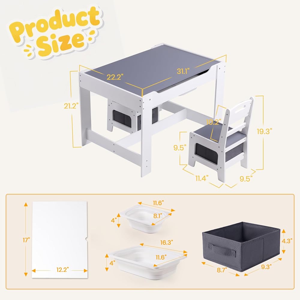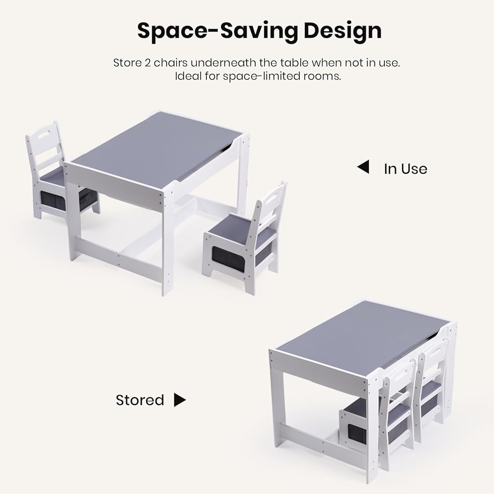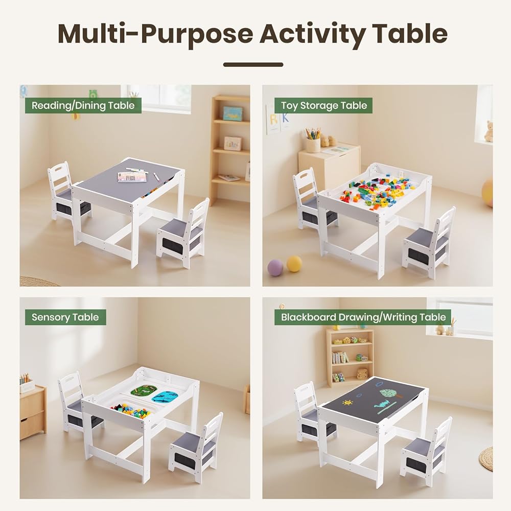 Multipurpose 4 in 1 Design - This kids table and chair set is designed with multi-functions for toddlers to use. The tabletop of blackboard side is for chalk drawing or writing, while another side is for reading, playing, eating and relaxing. After removing the tabletop, it can be used to store toys. Kids can build blocks, play toys and make crafts. Besides, You can remove the two panels underneath to make it as a sensory table for sand and water playing.
