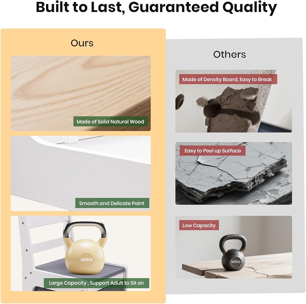 بناء الخشب الصلب - يتم بناء طاولة أطفالنا وكراسينا بخشب البتولا الصلب بدلاً من الخشب المصمم مقارنةً بالآخرين في السوق. The weight capacity of each chair reaches to 200lbs, and parents can sit with little kids together. The whole set is polished and burr-free for kids to use securely.