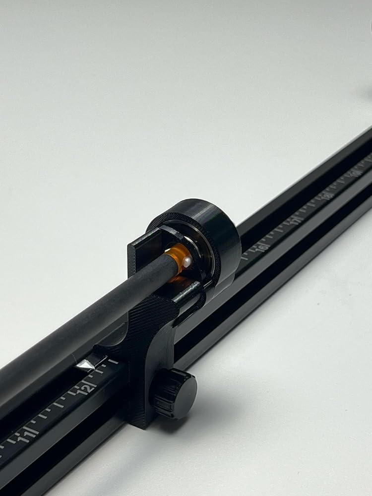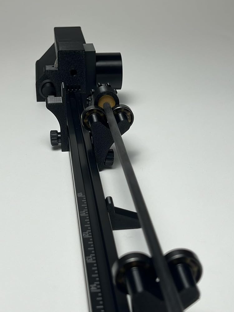 • Saw - 1. Adjust the rear rest on the saw by sliding the measurement indicator to the desired length you need to cut your arrows. Tighten the thumbscrew. 2. Adjust the middle rest to be centered between the saw blade and the rear rest. Tighten the thumbscrew. 3. Turn on the saw and slowly roll the arrow into the blade. 4. After cutting the carbon arrow shaft, move the arrow to the other side of the saw and rest it on the bearings.
